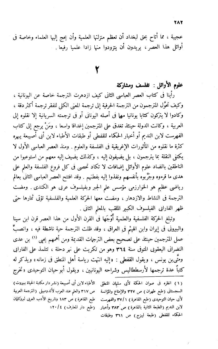 رأينا فى كتاب العصر العباسى الثانى كيف ازدهرت الترجمة خاصة عن اليونانية، وكيف تحوّل المترجمون من الترجمة الحرفية إلى ترجمة المعنى الكلى للفقر ترجمة أكثر دقة، وكادوا لا يتركون كتابا يونانيا مهما فى أصله اليونانى أو فى ترجمته السريانية إلا نقلوه إلى العربية، وكانت الدولة حينئذ تغدق على المترجمين إغداقا واسعا، ومن يرجع إلى كتاب الفهرست لابن النديم أو أخبار الحكماء للقفطى أو طبقات الأطباء لابن أبى أصيبعة يبهره كثرة ما نقلوه من المأثورات الإغريقية فى الفلسفة والعلوم. ومنذ العصر العباسى الأول لا يكتفى النقلة بما يترجمون، بل يضيفون إليه، وكذلك يضيف إليه معهم من استوعبوا من الناطقين بالضاد علوم الأوائل إضافات لا تكاد تحصى فى كل فروع الفلسفة والعلم على هدى ما قرءوه وجرّبوه بأنفسهم ونفذوا إليه بفطنهم. وقد افتتح العصر العباسى الثانى بعالم رياضى عظيم هو الخوارزمى مؤسس علم الجبر وبفيلسوف عربى هو الكندى. ومضت الترجمة فى النشاط والازدهار، ومضت معها الحركة العلمية والفلسفية تؤتى ثمارها حتى ظهر الفارابى الفيلسوف الكبير الملقب بالمعلم الثانى.
