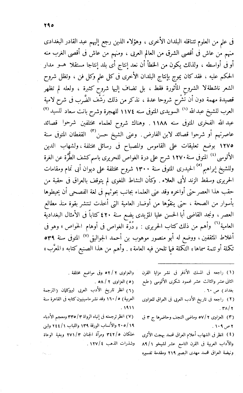فى علم من العلوم تتناقله البلدان الأخرى، وهؤلاء الذين رجع إليهم عبد القادر البغدادى منهم من عاش فى أقصى الشرق من العالم العربى، ومنهم من عاش فى أقصى الغرب منه أو فى أواسطه، ولذلك يكون من الخطأ أن نعد إنتاج أى بلد إنتاجا مستقلا هو مدار الحكم عليه، فقد كان يموج بإنتاج البلدان الأخرى فى كل علم وكل فن، وتظل شروح الشعر ناشطة لا الشروح المأثورة فقط، بل تضاف إليها شروح كثيرة، ولعله لم تظهر قصيدة مهمة دون أن تشرح شروحا عدة، نذكر من ذلك رشف الضّرب فى شرح لامية العرب للشيخ عبد الله (¬1) السويدى المتوفى سنة 1174 للهجرة وشرح بانت سعاد للسيد (¬2) عبد الله الفخرى المتوفى سنه 1188. وهناك شروح لعلماء مختلفين شرحوا قصائد عاصرتهم أو شرحوا قصائد لابن الفارض. وعنى الشيخ حسن (¬3) القفطان المتوفى سنة 1275 بوضع تعليقات على القاموس والمصباح فى رسائل مختلفة. ولشهاب الدين الألوسى (¬4) المتوفى سنة 1270 شرح على درة الغواص للحريرى باسم كشف الطّرّة عن الغرة وللشيخ إبراهيم (¬5) الحيدرى المتوفى سنة 1300 شروح مختلفة على ديوان أبى تمام ومقامات الحريرى وسقط الزند لأبى العلاء. وكأن النشاط اللغوى لم يتوقف بالعراق فى حقبة من حقب هذا العصر حتى أواخره وقد عنى العلماء بجانب بحوثهم فى لغة الفصحى أن يحيطوها بأسوار من الصحة، حتى ينقوّها من أوضار العامية التى أخذت تنتشر بقوة منذ مطالع العصر، ونجد القاضى أبا الحسن عليا المؤيدى يضع سنة 420 كتابا فى الأمثال البغدادية العامية (¬6) وأهم من ذلك كتاب الحريرى: «درّة الغواص فى أوهام الخواص» وهو فى أغلاط المثقفين، ووضع له أبو منصور موهوب بن أحمد الجواليقى (¬7) المتوفى سنة 539 تكملة أو تتمة سماها» التكملة فيما تلحن فيه العامة». وأهم من هذا الصنيع كتابه «المعرّب»