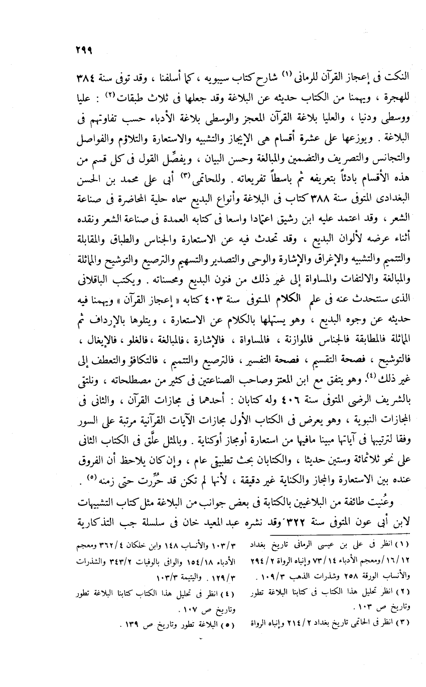 النكت فى إعجاز القرآن للرمانى (¬1) شارح كتاب سيبويه، كما أسلفنا، وقد توفى سنة 384 للهجرية، ويهمنا من الكتاب حديثه عن البلاغة وقد جعلها فى ثلاث طبقات (¬2): عليا ووسطى ودنيا، والعليا بلاغة القرآن المعجز والوسطى بلاغة الأدباء حسب تفاوتهم فى البلاغة. ويوزعها على عشرة أقسام هى الإيجاز والتشبيه والاستعارة والتلاؤم والفواصل والتجانس والتصريف والتضمين والمبالغة وحسن البيان، ويفصّل القول فى كل قسم من هذه الأقسام بادئا بتعريفه ثم باسطا تفريعاته. وللحاتمى (¬3) أبى على محمد بن الحسن البغدادى المتوفى سنة 388 كتاب فى البلاغة وأنواع البديع سماه حلية المحاضرة فى صناعة الشعر، وقد اعتمد عليه ابن رشيق اعتمادا واسعا فى كتابه العمدة فى صناعة الشعر ونقده أثناء عرضه لألوان البديع، وقد تحدث فيه عن الاستعارة والجناس والطباق والمقابلة والتتميم والتشبيه والإغراق والإشارة والوحى والتصدير والتسهيم والترصيع والتوشيح والمماثلة والمبالغة والالتفات والمساواة إلى غير ذلك من فنون البديع ومحسناته. ويكتب الباقلانى الذى سنتحدث عنه فى علم الكلام المتوفى سنة 403 كتابه «إعجاز القرآن» ويهمنا فيه حديثه عن وجوه البديع، وهو يستهلها بالكلام عن الاستعارة، ويتلوها بالإرداف ثم المماثلة فالمطابقة فالجناس فالموازنة، فالمساواة، فالإشارة، فالمبالغة، فالغلو، فالإيغال، فالتوشيح، فصحة التقسيم، فصحة التفسير، فالترصيع والتتميم، فالتكافؤ والتعطف إلى غير ذلك (¬4). وهو يتفق مع ابن المعتز وصاحب الصناعتين فى كثير من مصطلحاته، ونلتقى بالشريف الرضى المتوفى سنة 406 وله كتابان: أحدهما فى مجازات القرآن، والثانى فى المجازات النبوية، وهو يعرض فى الكتاب الأول مجازات الآيات القرآنية مرتبة على السور وفقا لترتيبها فى آياتها مبينا ما فيها من استعارة أو مجاز أو كناية. وبالمثل علّق فى الكتاب الثانى على نحو ثلاثمائة وستين حديثا، والكتابان بحث تطبيقى عام، وإن كان يلاحظ أن الفروق عنده بين الاستعارة والمجاز والكناية غير دقيقة، لأنها لم تكن قد حرّرت حتى زمنه (¬5).