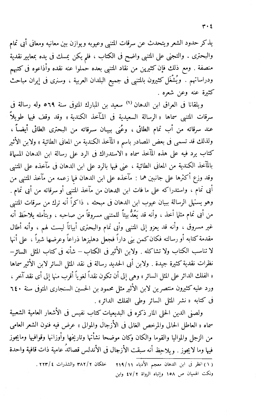 ويلقانا فى العراق ابن الدهان (¬1) سعيد بن المبارك المتوفى سنة 569 وله رسالة فى سرقات المتنبى سماها «الرسالة السعيدية فى المآخذ الكندية» وقد وقف فيها طويلا عند سرقاته من أبى تمام الطائى، وعنى ببيان سرقاته من البحترى الطائى أيضا، ولذلك قد تسمى فى بعض المصادر باسم «المآخذ الكندية من المعانى الطائية» ولابن الأثير كتاب يرد فيه على هذه المآخذ سماه «الاستدراك فى الرد على رسالة ابن الدهان المسماة بالمآخذ الكندية من المعانى الطائية، عنى فيها بالرد على ابن الدهان فى مآخذه على المتنبى وقد وزع أكثرها على جانبين هما: مآخذه على ابن الدهان فيما زعمه من مآخذ المتنبى من أبى تمام، واستدراكه على ما فات ابن الدهان من مآخذ المتنبى أو سرقاته من أبى تمام.
