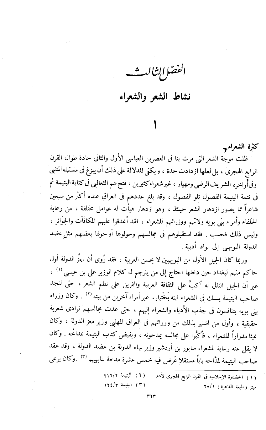 وربما كان الجيل الأول من البويهيين لا يحسن العربية، فقد روى أن معزّ الدولة أول حاكم منهم لبغداد حين دخلها احتاج إلى من يترجم له كلام الوزير على بن عيسى (¬1)، غير أن الجيل التالى له أكبّ على الثقافة العربية والتمرين على نظم الشعر، حتى لنجد صاحب اليتيمة يسلك فى الشعراء ابنه بختيار، غير أمراء آخرين من بيته (¬2). وكان وزراء بنى بويه يتنافسون فى جذب الأدباء والشعراء إليهم، حتى غدت مجالسهم نوادى شعرية حقيقية، وأول من اشتهر بذلك من وزرائهم فى العراق المهلبى وزير معز الدولة، وكان غيثا مدرارا للشعراء، فأكبّوا على مجالسه يمدحونه، ويفيض كتاب اليتيمة بمدائحه. وكان لا يقل عنه رعاية للشعراء سابور بن أردشير وزير بهاء الدولة بن عضد الدولة، وقد عقد صاحب اليتيمة لمدّاحه بابا مستقلا عرض فيه خمس عشرة مدحة لنابهيهم (¬3). وكان يرعى
