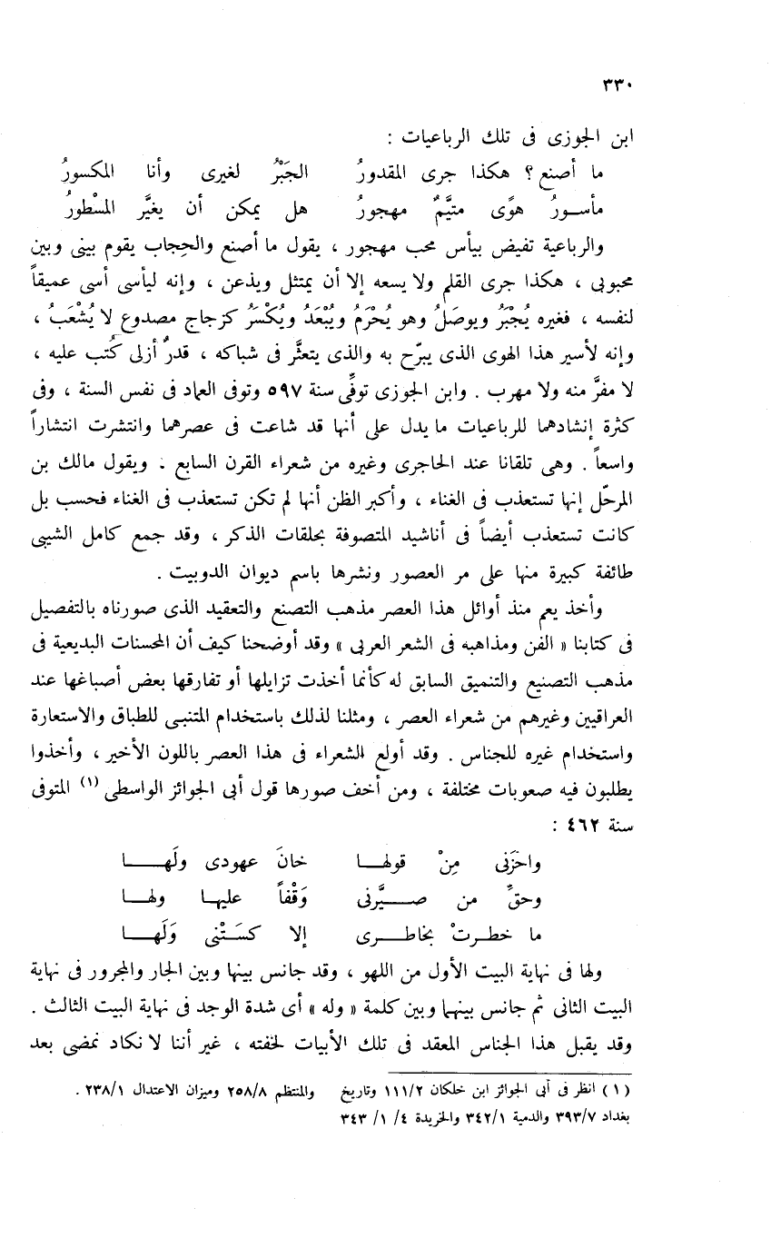والرباعية تفيض بيأس محب مهجور، يقول ما أصنع والحجاب يقوم بينى وبين محبوبى، هكذا جرى القلم ولا يسعه إلا أن يمتثل ويذعن، وإنه ليأسى أسى عميقا لنفسه، فغيره يجبر ويوصل وهو يحرم ويبعد ويكسر كزجاج مصدوع لا يشعب، وإنه لأسير هذا الهوى الذى يبرّح به والذى يتعثّر فى شباكه، قدر أزلى كتب عليه، لا مفرّ منه ولا مهرب. وابن الجوزى توفّى سنة 597 وتوفى العماد فى نفس السنة، وفى كثرة إنشادهما للرباعيات ما يدل على أنها قد شاعت فى عصرهما وانتشرت انتشارا واسعا. وهى تلقانا عند الحاجرى وغيره من شعراء القرن السابع. ويقول مالك بن المرحلّ إنها تستعذب فى الغناء، وأكبر الظن أنها لم تكن تستعذب فى الغناء فحسب بل كانت تستعذب أيضا فى أناشيد المتصوفة بحلقات الذكر، وقد جمع كامل الشيبى طائفة كبيرة منها على مر العصور ونشرها باسم ديوان الدوبيت.
