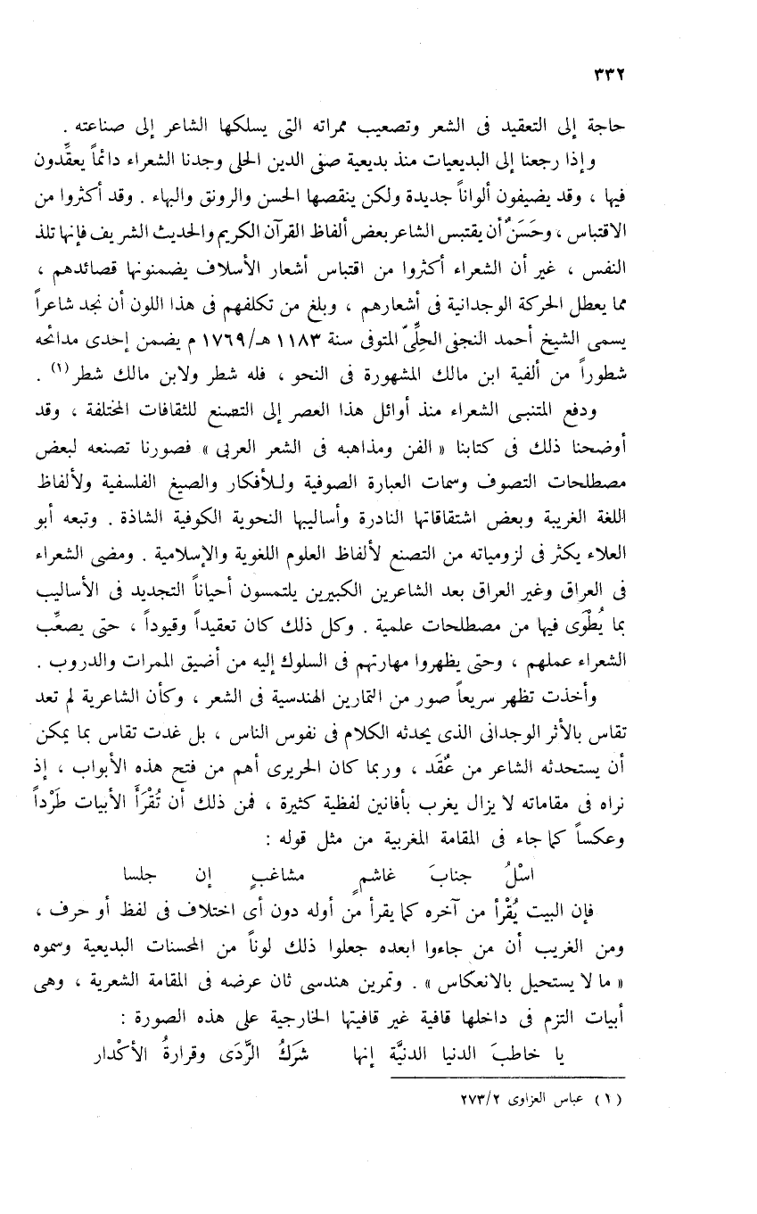 ودفع المتنبى الشعراء منذ أوائل هذا العصر إلى التصنع للثقافات المختلفة، وقد أوضحنا ذلك فى كتابنا «الفن ومذاهبه فى الشعر العربى» فصورنا تصنعه لبعض مصطلحات التصوف وسمات العبارة الصوفية وللأفكار والصيغ الفلسفية ولألفاظ اللغة الغريبة وبعض اشتقاقاتها النادرة وأساليبها النحوية الكوفية الشاذة. وتبعه أبو العلاء يكثر فى لزومياته من التصنع لألفاظ العلوم اللغوية والإسلامية. ومضى الشعراء فى العراق وغير العراق بعد الشاعرين الكبيرين يلتمسون أحيانا التجديد فى الأساليب بما يطوى فيها من مصطلحات علمية. وكل ذلك كان تعقيدا وقيودا، حتى يصعّب الشعراء عملهم، وحتى يظهروا مهارتهم فى السلوك إليه من أضيق الممرات والدروب.