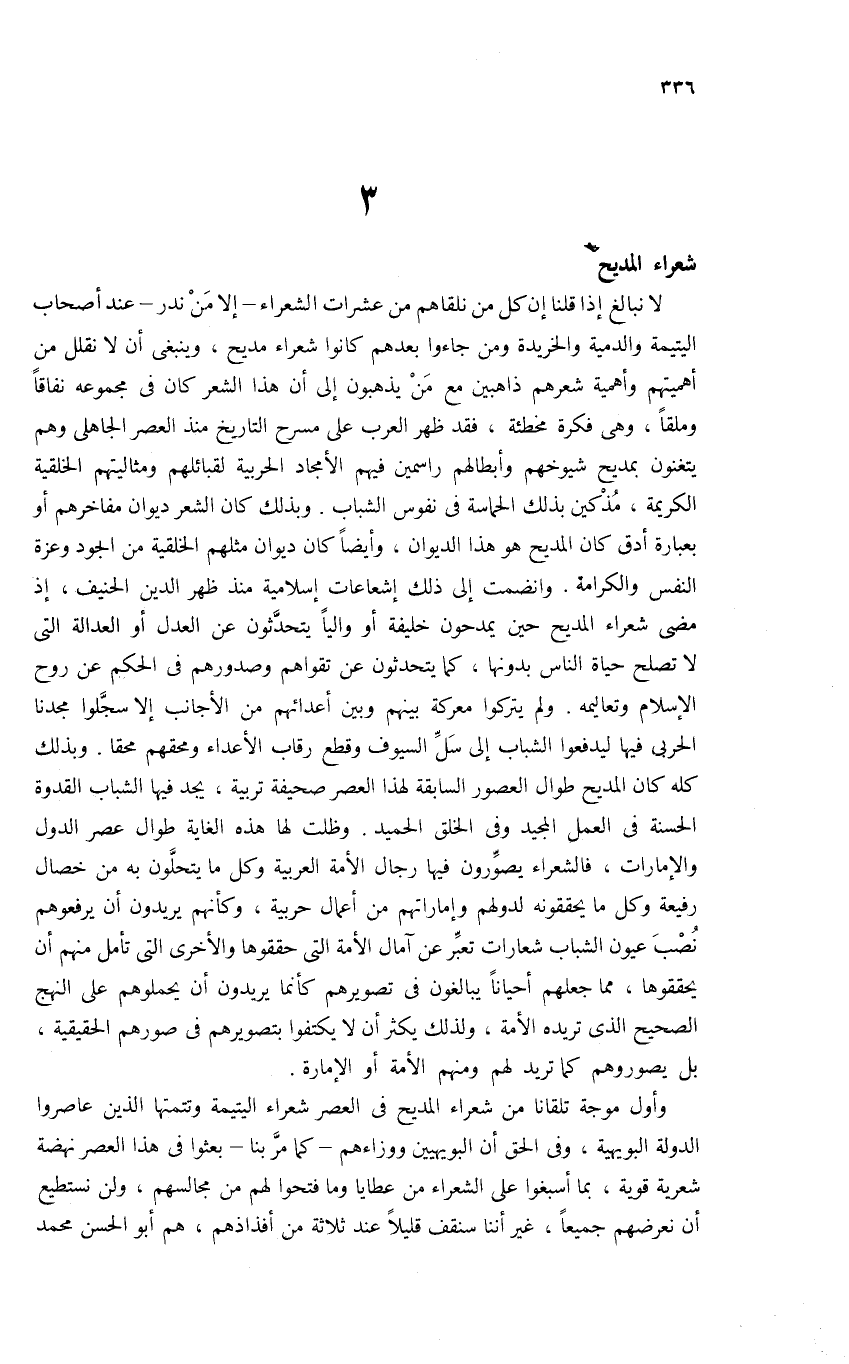 لا نبالغ إذا قلنا إن كل من نلقاهم من عشرات الشعراء-إلا من ندر-عند أصحاب اليتيمة والدمية والخريدة ومن جاءوا بعدهم كانوا شعراء مديح، وينبغى أن لا نقلل من أهميتهم وأهمية شعرهم ذاهبين مع من يذهبون إلى أن هذا الشعر كان فى مجموعه نفاقا وملقا، وهى فكرة مخطئة، فقد ظهر العرب على مسرح التاريخ منذ العصر الجاهلى وهم يتغنون بمديح شيوخهم وأبطالهم راسمين فيهم الأمجاد الحربية لقبائلهم ومثاليتهم الخلقية الكريمة، مذكين بذلك الحماسة فى نفوس الشباب. وبذلك كان الشعر ديوان مفاخرهم أو بعبارة أدق كان المديح هو هذا الديوان، وأيضا كان ديوان مثلهم الخلقية من الجود وعزة النفس والكرامة. وانضمت إلى ذلك إشعاعات إسلامية منذ ظهر الدين الحنيف، إذ مضى شعراء المديح حين يمدحون خليفة أو واليا يتحدّثون عن العدل أو العدالة التى لا تصلح حياة الناس بدونها، كما يتحدثون عن تقواهم وصدورهم فى الحكم عن روح الإسلام وتعاليمه. ولم يتركوا معركة بينهم وبين أعدائهم من الأجانب إلا سجّلوا مجدنا الحربى فيها ليدفعوا الشباب إلى سلّ السيوف وقطع رقاب الأعداء ومحقهم محقا. وبذلك كله كان المديح طوال العصور السابقة لهذا العصر صحيفة تربية، يجد فيها الشباب القدوة الحسنة فى العمل المجيد وفى الخلق الحميد. وظلت لها هذه الغاية طوال عصر الدول والإمارات، فالشعراء يصوّرون فيها رجال الأمة العربية وكل ما يتحلّون به من خصال رفيعة وكل ما يحققونه لدولهم وإماراتهم من أعمال حربية، وكأنهم يريدون أن يرفعوهم نصب عيون الشباب شعارات تعبّر عن آمال الأمة التى حققوها والأخرى التى تأمل منهم أن يحققوها، مما جعلهم أحيانا يبالغون فى تصويرهم كأنما يريدون أن يحملوهم على النهج الصحيح الذى تريده الأمة، ولذلك يكثر أن لا يكتفوا بتصويرهم فى صورهم الحقيقية، بل يصوروهم كما تريد لهم ومنهم الأمة أو الإمارة.