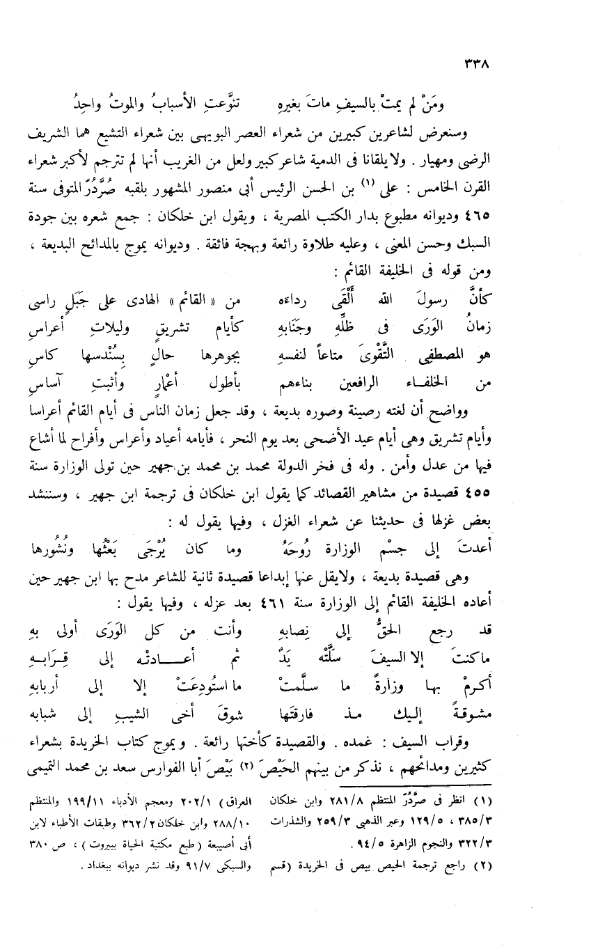 وسنعرض لشاعرين كبيرين من شعراء العصر البويهى بين شعراء التشيع هما الشريف الرضى ومهيار. ولا يلقانا فى الدمية شاعر كبير ولعل من الغريب أنها لم تترجم لأكبر شعراء القرن الخامس: على (¬1) بن الحسن الرئيس أبى منصور المشهور بلقبه صرّدرّ المتوفى سنة 465 وديوانه مطبوع بدار الكتب المصرية، ويقول ابن خلكان: جمع شعره بين جودة السبك وحسن المعنى، وعليه طلاوة رائعة وبهجة فائقة. وديوانه يموج بالمدائح البديعة، ومن قوله فى الخليفة القائم: