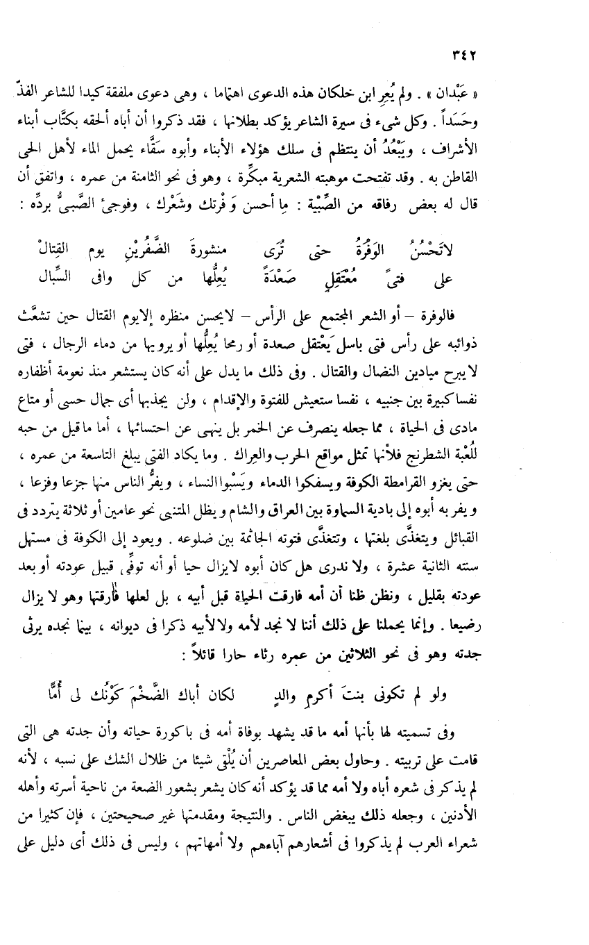 «عبدان». ولم يعر ابن خلكان هذه الدعوى اهتماما، وهى دعوى ملفقة كيدا للشاعر الفذّ وحسدا. وكل شئ فى سيرة الشاعر يؤكد بطلانها، فقد ذكروا أن أباه ألحقه بكتّاب أبناء الأشراف، ويبعد أن ينتظم فى سلك هؤلاء الأبناء وأبوه سقّاء يحمل الماء لأهل الحى القاطن به. وقد تفتحت موهبته الشعرية مبكّرة، وهو فى نحو الثامنة من عمره، واتفق أن قال له بعض رفاقه من الصّبية: ما أحسن وفرتك وشعرك، وفوجئ الصّبىّ بردّه: