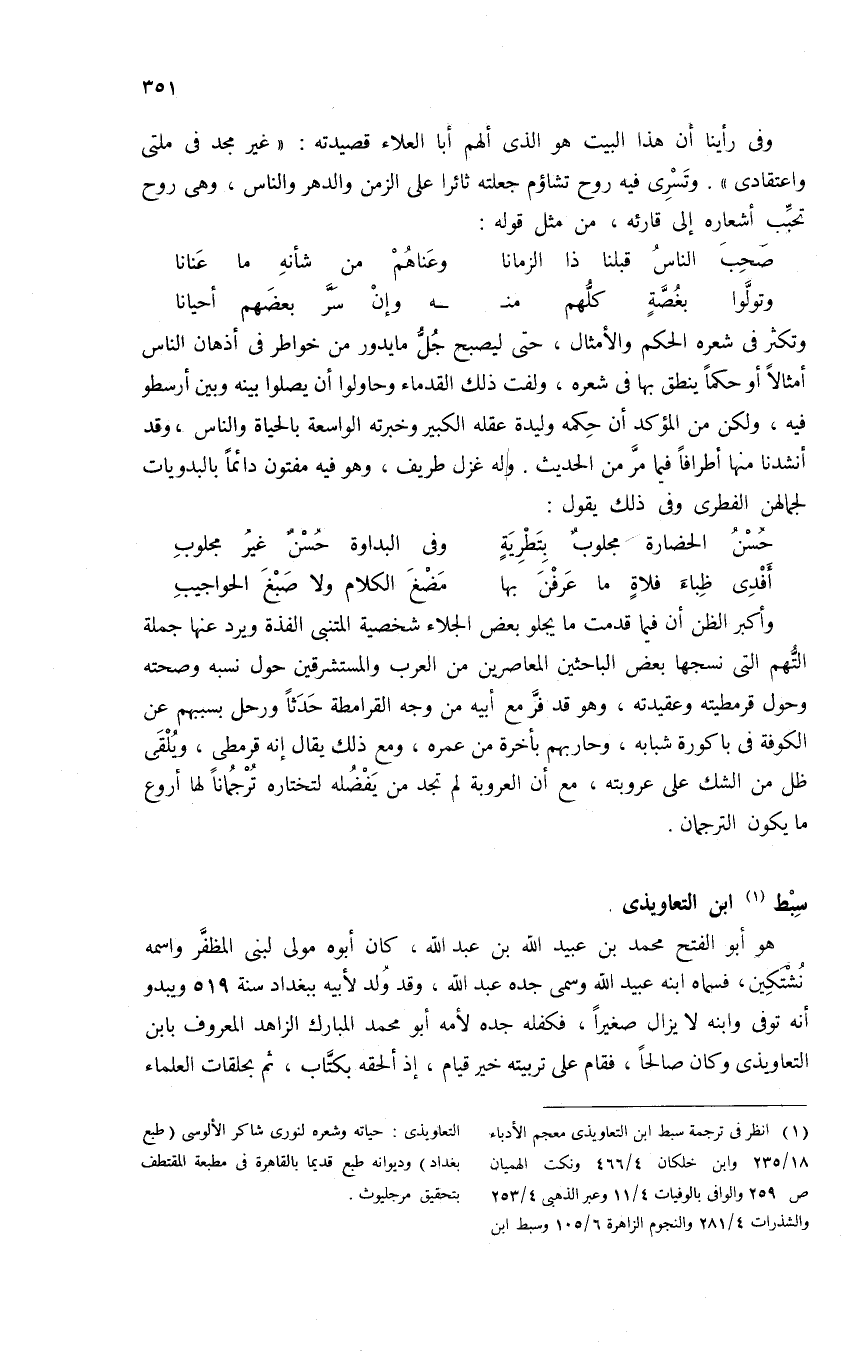 (¬1) انظر فى ترجمة سبط ابن التعاويذى معجم الأدباء 18/ 235 وابن خلكان 4/ 466 ونكت الهميان ص 259 والوافى بالوفيات 4/ 11 وعبر الذهبى 4/ 253 والشذرات 4/ 281 والنجوم الزاهرة 6/ 105 وسبط ابن التعاويذى: حياته وشعره لنورى شاكر الألوسى (طبع بغداد) وديوانه طبع قديما بالقاهرة فى مطبعة المقتطف بتحقيق مرجليوث.
