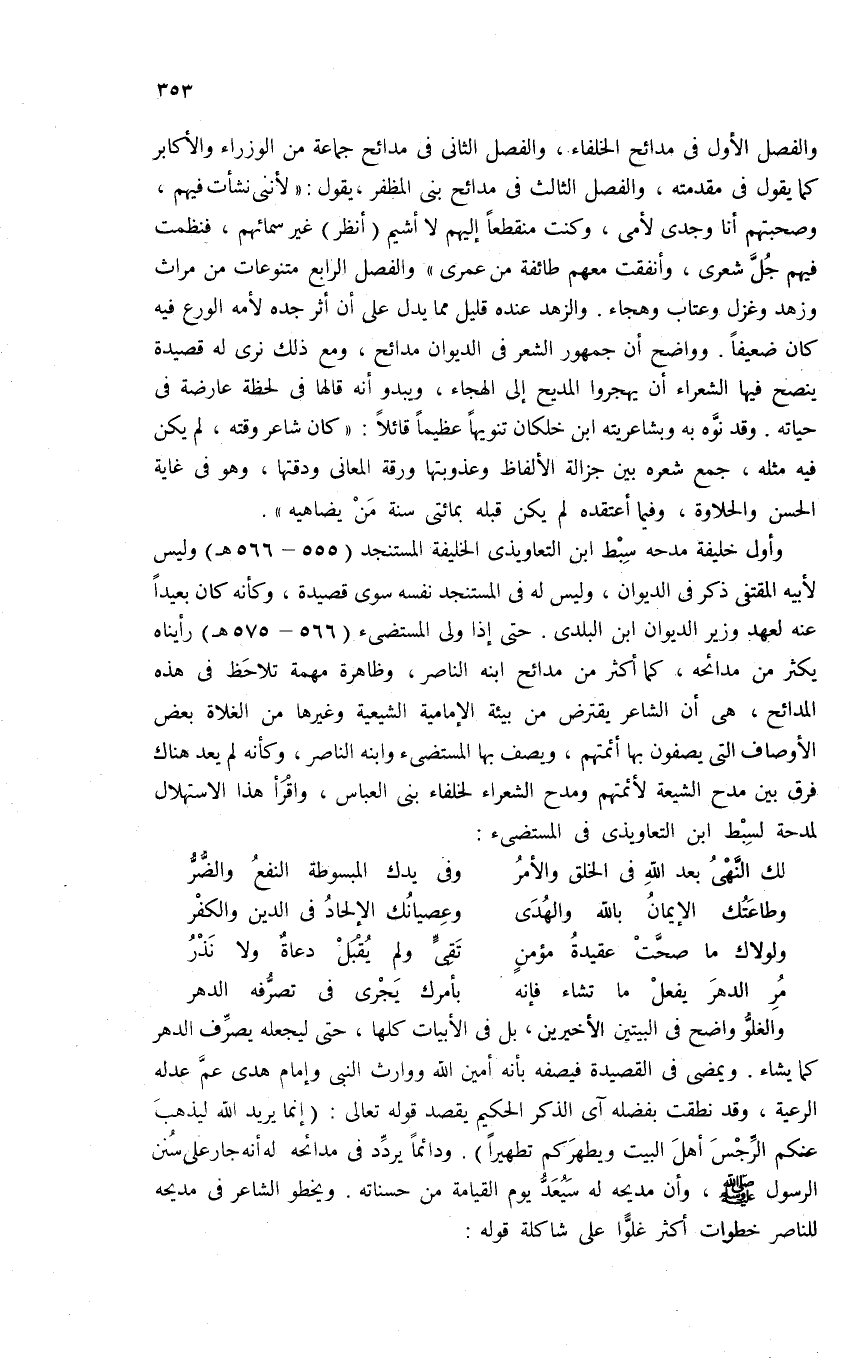 وأول خليفة مدحه سبط ابن التعاويذى الخليفة المستنجد (555 - 566 هـ) وليس لأبيه المقتفى ذكر فى الديوان، وليس له فى المستنجد نفسه سوى قصيدة، وكأنه كان بعيدا عنه لعهد وزير الديوان ابن البلدى. حتى إذا ولى المستضئ (566 - 575 هـ) رأيناه يكثر من مدائحه، كما أكثر من مدائح ابنه الناصر، وظاهرة مهمة تلاحظ فى هذه المدائح، هى أن الشاعر يقترض من بيئة الإمامية الشيعية وغيرها من الغلاة بعض الأوصاف التى يصفون بها أئمتهم، ويصف بها المستضئ وابنه الناصر، وكأنه لم يعد هناك فرق بين مدح الشيعة لأئمتهم ومدح الشعراء لخلفاء بنى العباس، واقرأ هذا الاستهلال لمدحة لسبط ابن التعاويذى فى المستضئ:
