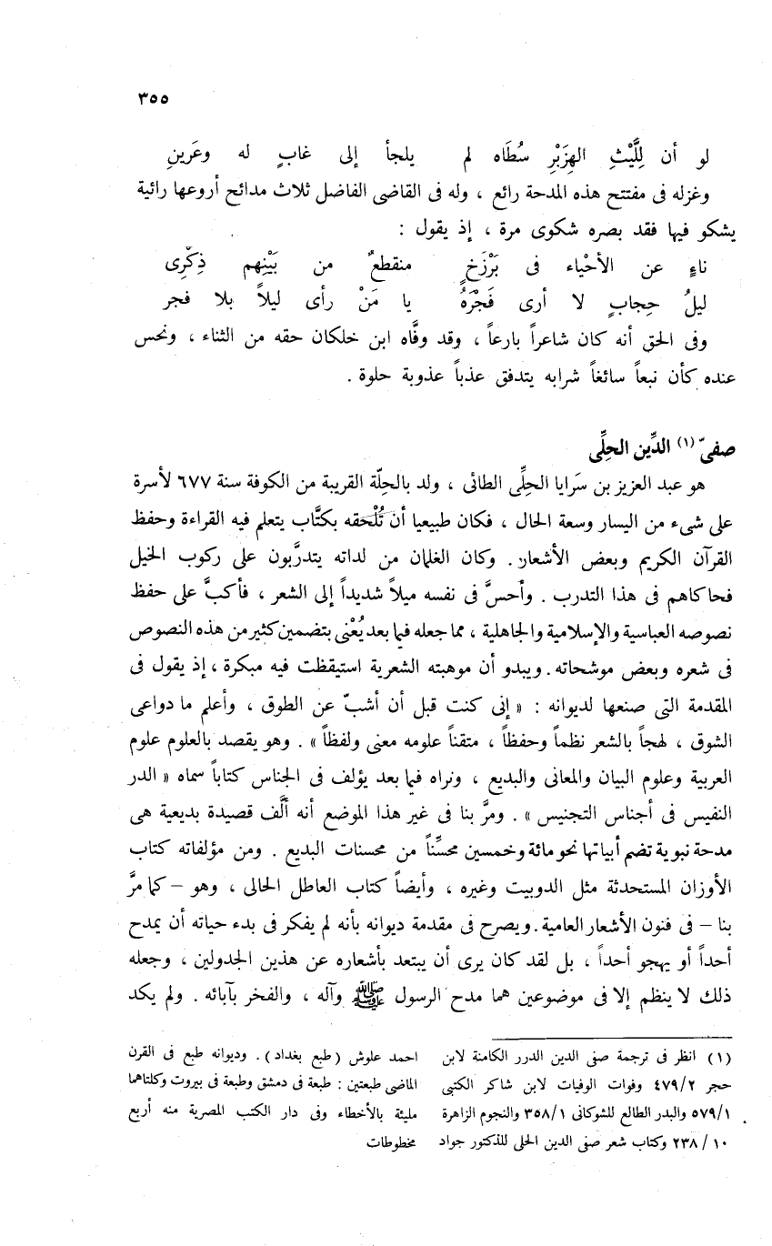 (¬1) انظر فى ترجمة صفى الدين الدرر الكامنة لابن حجر 2/ 479 وفوات الوفيات لابن شاكر الكتبى 1/ 579 والبدر الطالع للشوكانى 1/ 358 والنجوم الزاهرة 10/ 238 وكتاب شعر صفى الدين الحلى للدكتور جواد احمد علوش (طبع بغداد). وديوانه طبع فى القرن الماضى طبعتين: طبعة فى دمشق وطبعة فى بيروت وكلتاهما مليئة بالأخطاء وفى دار الكتب المصرية منه أربع مخطوطات