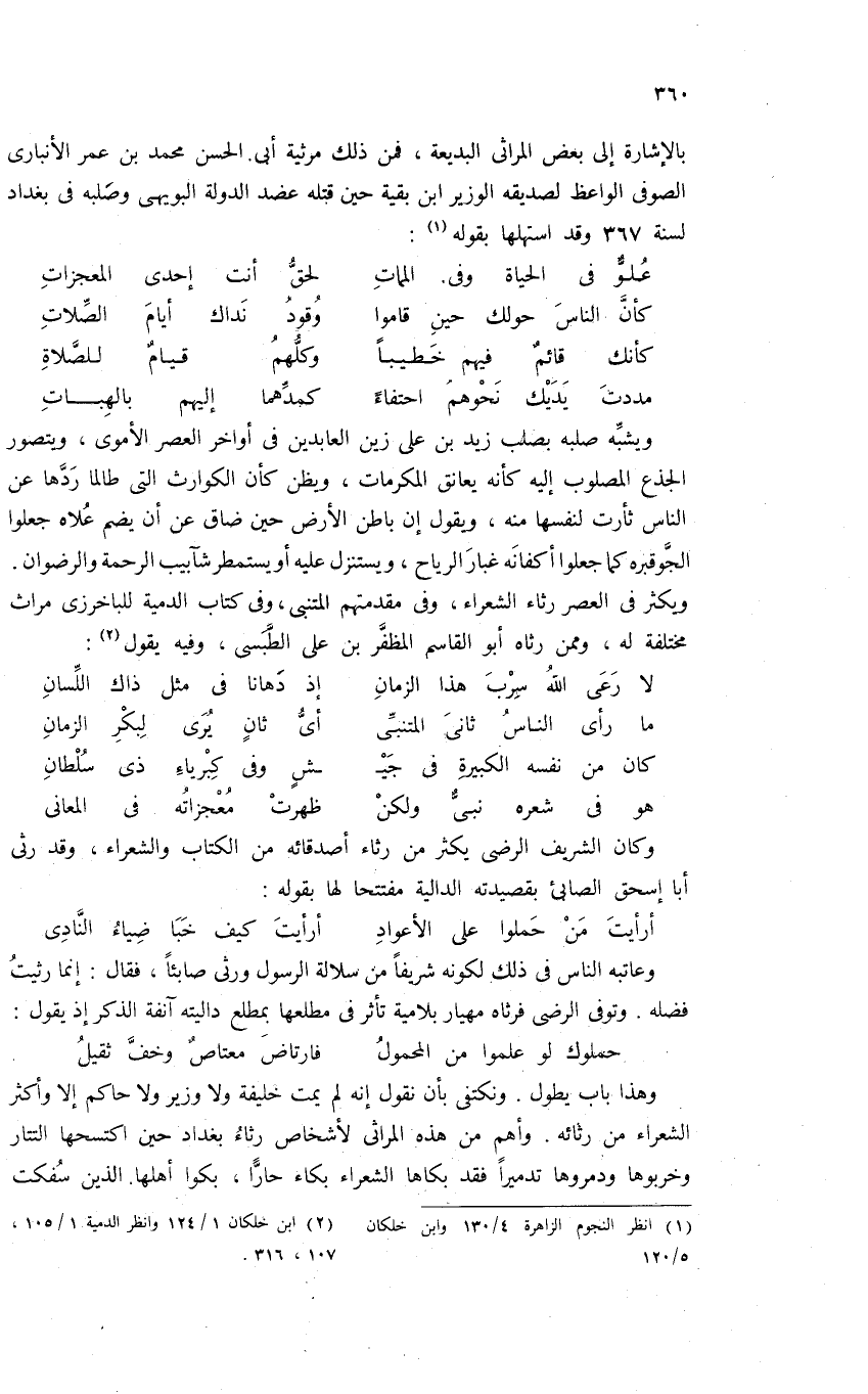 بالإشارة إلى بعض المراثى البديعة، فمن ذلك مرثية أبى الحسن محمد بن عمر الأنبارى الصوفى الواعظ لصديقه الوزير ابن بقية حين قتله عضد الدولة البويهى وصلبه فى بغداد لسنة 367 وقد استهلها بقوله (¬1):