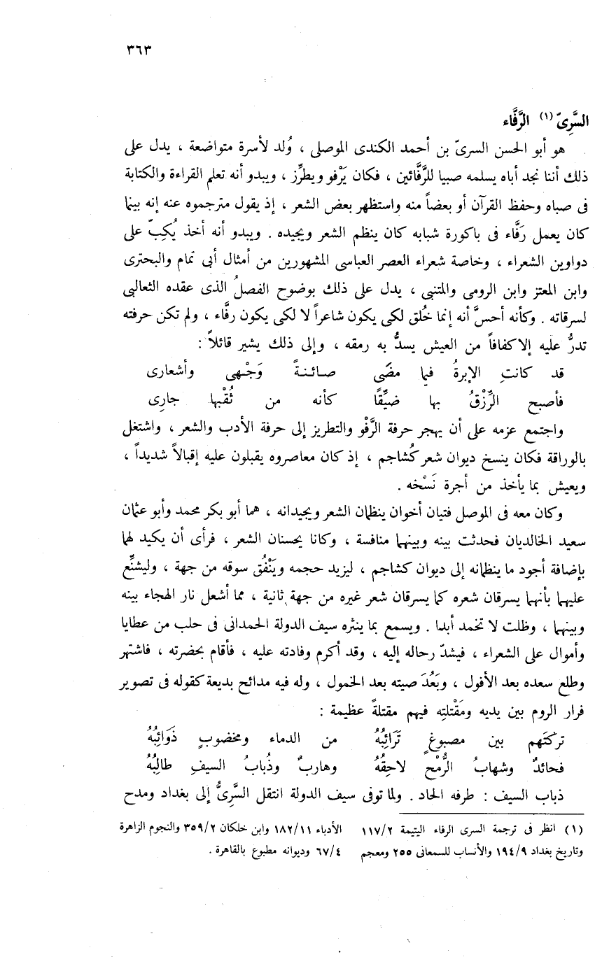 (¬1) انظر فى ترجمة السرى الرفاء اليتيمة 2/ 117 وتاريخ بغداد 9/ 194 والأنساب للسمعانى 255 ومعجم الأدباء 11/ 182 وابن خلكان 2/ 359 والنجوم الزاهرة 4/ 67 وديوانه مطبوع بالقاهرة.