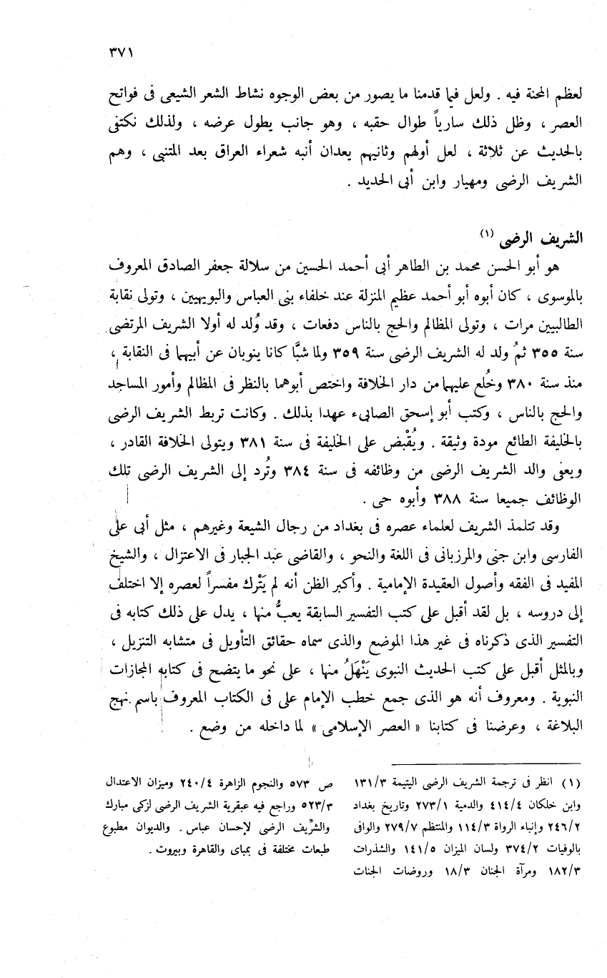 (¬1) انظر فى ترجمة الشريف الرضى اليتيمة 3/ 131 وابن خلكان 4/ 414 والدمية 1/ 273 وتاريخ بغداد 2/ 246 وإنباه الرواة 3/ 114 والمنتظم 7/ 279 والوافى بالوفيات 2/ 374 ولسان الميزان 5/ 141 والشذرات 3/ 182 ومرآة الجنان 3/ 18 وروضات الجنات ص 573 والنجوم الزاهرة 4/ 240 وميزان الاعتدال 3/ 523 وراجع فيه عبقرية الشريف الرضى لزكى مبارك والشريف الرضى لإحسان عباس. والديوان مطبوع طبعات مختلفة فى بمباى والقاهرة وبيروت.