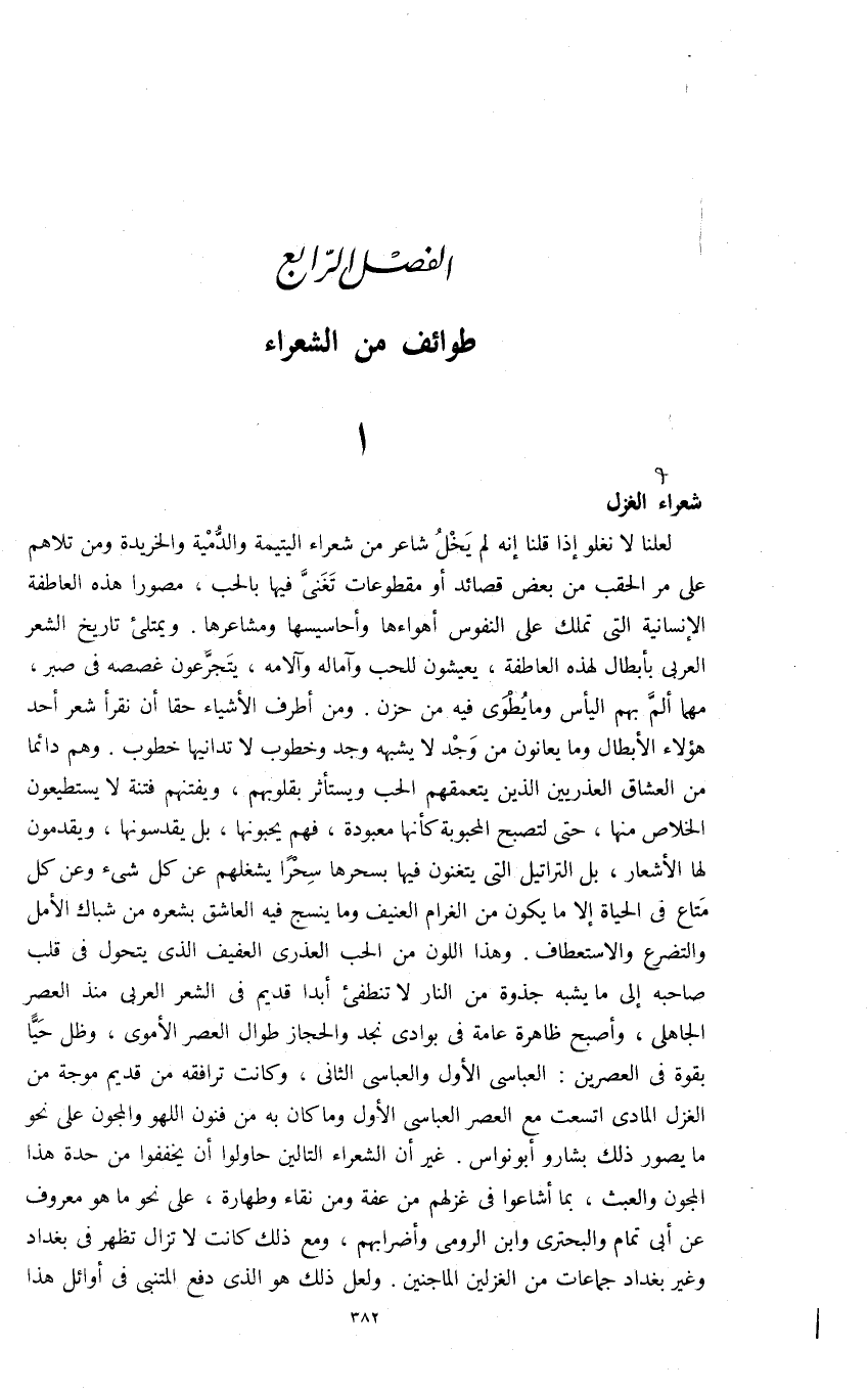 لعلنا لا نغلو إذا قلنا إنه لم يخل شاعر من شعراء اليتيمة والدّمية والخريدة ومن تلاهم على مر الحقب من بعض قصائد أو مقطوعات تغنىّ فيها بالحب، مصورا هذه العاطفة الإنسانية التى تملك على النفوس أهواءها وأحاسيسها ومشاعرها. ويمتلئ تاريخ الشعر العربى بأبطال لهذه العاطفة، يعيشون للحب وآماله وآلامه، يتجرّعون غصصه فى صبر، مهما ألمّ بهم اليأس وما يطوى فيه من حزن. ومن أطرف الأشياء حقا أن نقرأ شعر أحد هؤلاء الأبطال وما يعانون من وجد لا يشبهه وجد وخطوب لا تدانيها خطوب. وهم دائما من العشاق العذريين الذين يتعمقهم الحب ويستأثر بقلوبهم، ويفتنهم فتنة لا يستطيعون الخلاص منها، حتى لتصبح المحبوبة كأنها معبودة، فهم يحبونها، بل يقدسونها، ويقدمون لها الأشعار، بل التراتيل التى يتغنون فيها بسحرها سحرا يشغلهم عن كل شئ وعن كل متاع فى الحياة إلا ما يكون من الغرام العنيف وما ينسج فيه العاشق بشعره من شباك الأمل والتضرع والاستعطاف. وهذا اللون من الحب العذرى العفيف الذى يتحول فى قلب صاحبه إلى ما يشبه جذوة من النار لا تنطفئ أبدا قديم فى الشعر العربى منذ العصر الجاهلى، وأصبح ظاهرة عامة فى بوادى نجد والحجاز طوال العصر الأموى، وظل حيّا بقوة فى العصرين: العباسى الأول والعباسى الثانى، وكانت ترافقه من قديم من موجة من الغزل المادى اتسعت مع العصر العباسى الأول وما كان به من فنون اللهو والمجون على نحو ما يصور ذلك بشارو أبو نواس. غير أن الشعراء التالين حاولوا أن يخففوا من حدة هذا المجون والعبث، بما أشاعوا فى غزلهم من عفة ومن نقاء وطهارة، على نحو ما هو معروف عن أبى تمام والبحترى وابن الرومى وأضرابهم، ومع ذلك كانت لا تزال تظهر فى بغداد وغير بغداد جماعات من الغزلين الماجنين. ولعل ذلك هو الذى دفع المتنبى فى أوائل هذا