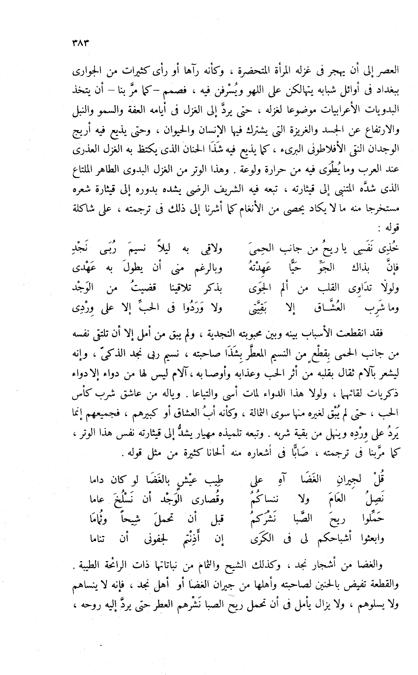 العصر إلى أن يهجر فى غزله المرأة المتحضرة، وكأنه رآها أو رأى كثيرات من الجوارى ببغداد فى أوائل شبابه يتهالكن على اللهو ويسرفن فيه، فصمم-كما مرّ بنا-أن يتخذ البدويات الأعرابيات موضوعا لغزله، حتى يردّ إلى الغزل فى أيامه العفة والسمو والنبل والارتفاع عن الجسد والغريزة التى يشترك فيها الإنسان والحيوان، وحتى يذيع فيه أريج الوجدان النقى الأفلاطونى البرئ، كما يذيع فيه شذا الحنان الذى يكتظ به الغزل العذرى عند العرب وما يطوى فيه من حرارة ولوعة. وهذا الوتر من الغزل البدوى الطاهر الملتاع الذى شدّه المتنبى إلى قيثارته، تبعه فيه الشريف الرضى يشده بدوره إلى قيثارة شعره مستخرجا منه ما لا يكاد يحصى من الأنغام كما أشرنا إلى ذلك فى ترجمته، على شاكلة قوله:
