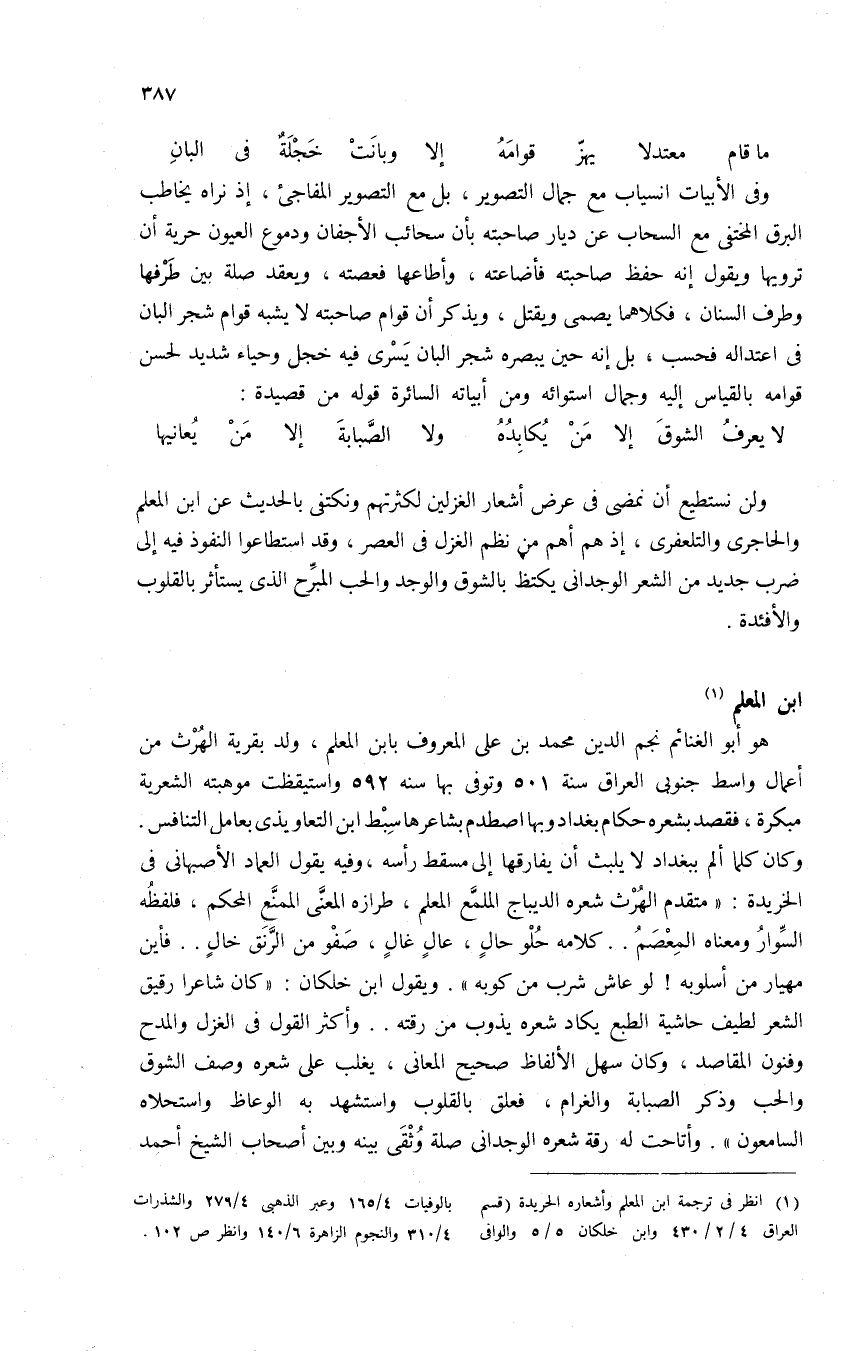 (¬1) انظر فى ترجمة ابن المعلم وأشعاره الخريدة (قسم العراق 4/ 2/430 وابن خلكان 5/ 5 والوافى بالوفيات 4/ 165 وعبر الذهبى 4/ 276 والشذرات 4/ 310 والنجوم الزاهرة 6/ 140 وانظر ص 102.