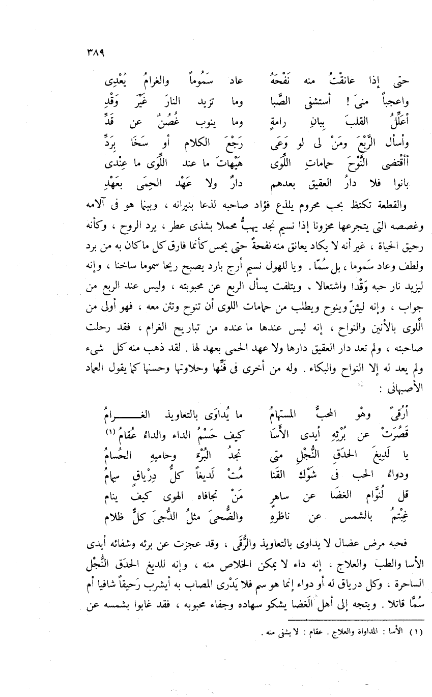 فحبه مرض عضال لا يداوى بالتعاويذ والرّقى، وقد عجزت عن برئه وشفائه أيدى الأسا والطب والعلاج، إنه داء لا يمكن الخلاص منه، وإنه للديغ الحدق النّجل الساحرة، وكل درياق له أو دواء إنما هو سم فلا يدرى المصاب به أيشرب رحيقا شافيا أم سمّا قاتلا. ويتجه إلى أهل الغضا يشكو سهاده وجفاء محبوبه، فقد غابوا بشمسه عن
