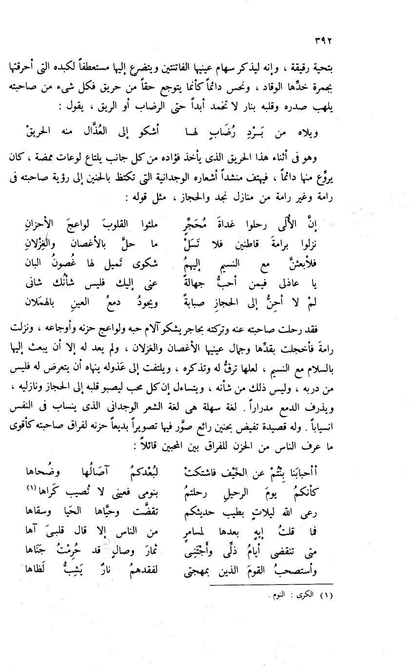 وهو فى أثناء هذا الحريق الذى يأخذ فؤاده من كل جانب يلتاع لوعات ممضة، كان يروّع منها دائما، فيهتف منشدا أشعاره الوجدانية التى تكتظ بالحنين إلى رؤية صاحبته فى رامة وغير رامة من منازل نجد والحجاز، مثل قوله: