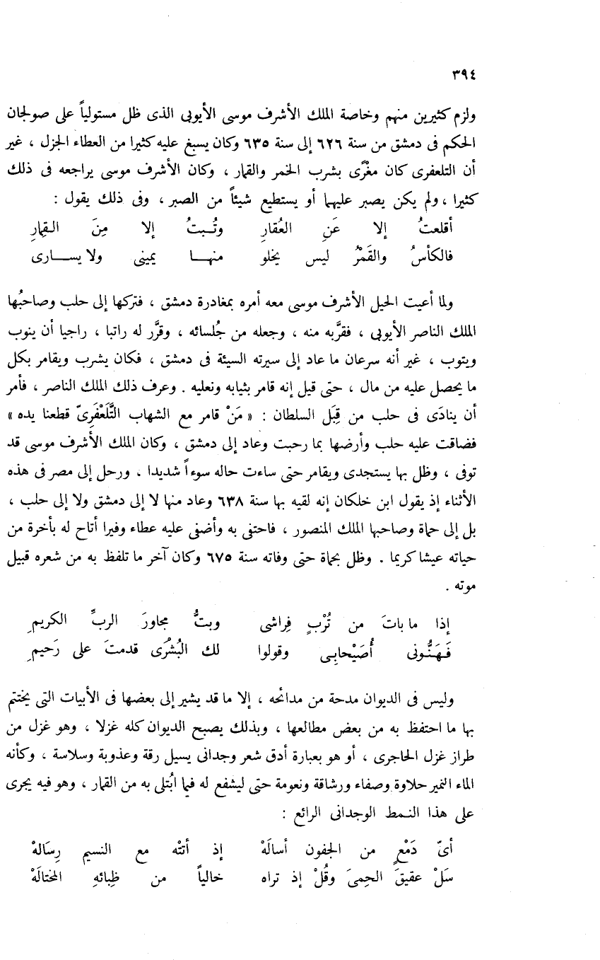 ولزم كثيرين منهم وخاصة الملك الأشرف موسى الأيوبى الذى ظل مستوليا على صولجان الحكم فى دمشق من سنة 626 إلى سنة 635 وكان يسبغ عليه كثيرا من العطاء الجزل، غير أن التلعفرى كان مغرى بشرب الخمر والقمار، وكان الأشرف موسى يراجعه فى ذلك كثيرا، ولم يكن يصبر عليهما أو يستطيع شيئا من الصبر، وفى ذلك يقول: