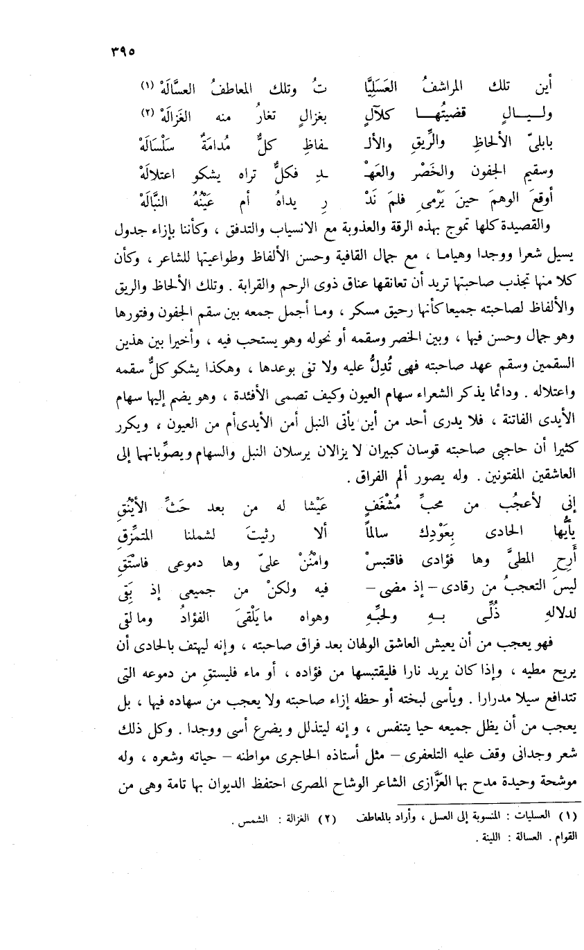 والقصيدة كلها تموج بهذه الرقة والعذوبة مع الانسياب والتدفق، وكأننا بإزاء جدول يسيل شعراء ووجدا وهياما، مع جمال القافية وحسن الألفاظ وطواعيتها للشاعر، وكأن كلا منها تجذب صاحبتها تريد أن تعانقها عناق ذوى الرحم والقرابة. وتلك الألحاظ والريق والألفاظ لصاحبته جميعا كأنها رحيق مسكر، وما أجمل جمعه بين سقم الجفون وفتورها وهو جمال وحسن فيها، وبين الخصر وسقمه أو نحو له وهو يستحب فيه، وأخيرا بين هذين السقمين وسقم عهد صاحبته فهى تدلّ عليه ولا تفى بوعدها، وهكذا يشكو كلّ سقمه واعتلاله. ودائما يذكر الشعراء سهام العيون وكيف تصمى الأفئدة، وهو يضم إليها سهام الأيدى الفاتنة، فلا يدرى أحد من أين يأتى النبل أمن الأيدى أم من العيون، ويكرر كثيرا أن حاجبى صاحبته قوسان كبيران لا يزالان يرسلان النبل والسهام ويصوّبانهما إلى العاشقين المفتونين. وله يصور ألم الفراق.