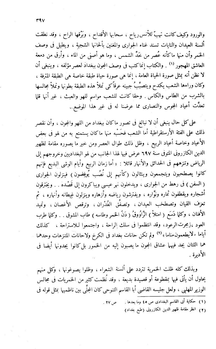 والورود وكيف كانت تهبّ للأنس رياح، سحابها الأقداح، وبرقها الراح، وقد نطقت ألسنة العيدان والنايات تسند غناء الجوارى والمغنين بألحانها الشجية، ويطيل فى وصف الخمر وأن منها ما كأنه عصر من خدّ الشمس، وما هو أصفى من الماء، وأرق من دمعة العاشق المهجور (¬1). والكتاب إنما كتب فى وصف المجون ببغداد لعصر مؤلفه، وينبغى أن لا نظن أنه يمثل صورة الحياة العامة، إنما هى صورة حياة طبقة خاصة هى الطبقة المترفة، وكان وراءها الشعب يكدح ويتصبّب جبينه عرقا كى تملأ هذه الطبقة بطونها وتملأ مجالسها بالشرب من الطاس والكاس. وحقا كانت للشعب مواسم للهو والعبث، غير أنها قلما تعدّت أعياد المجوس والنصارى مما عرضنا له فى غير هذا الموضع.