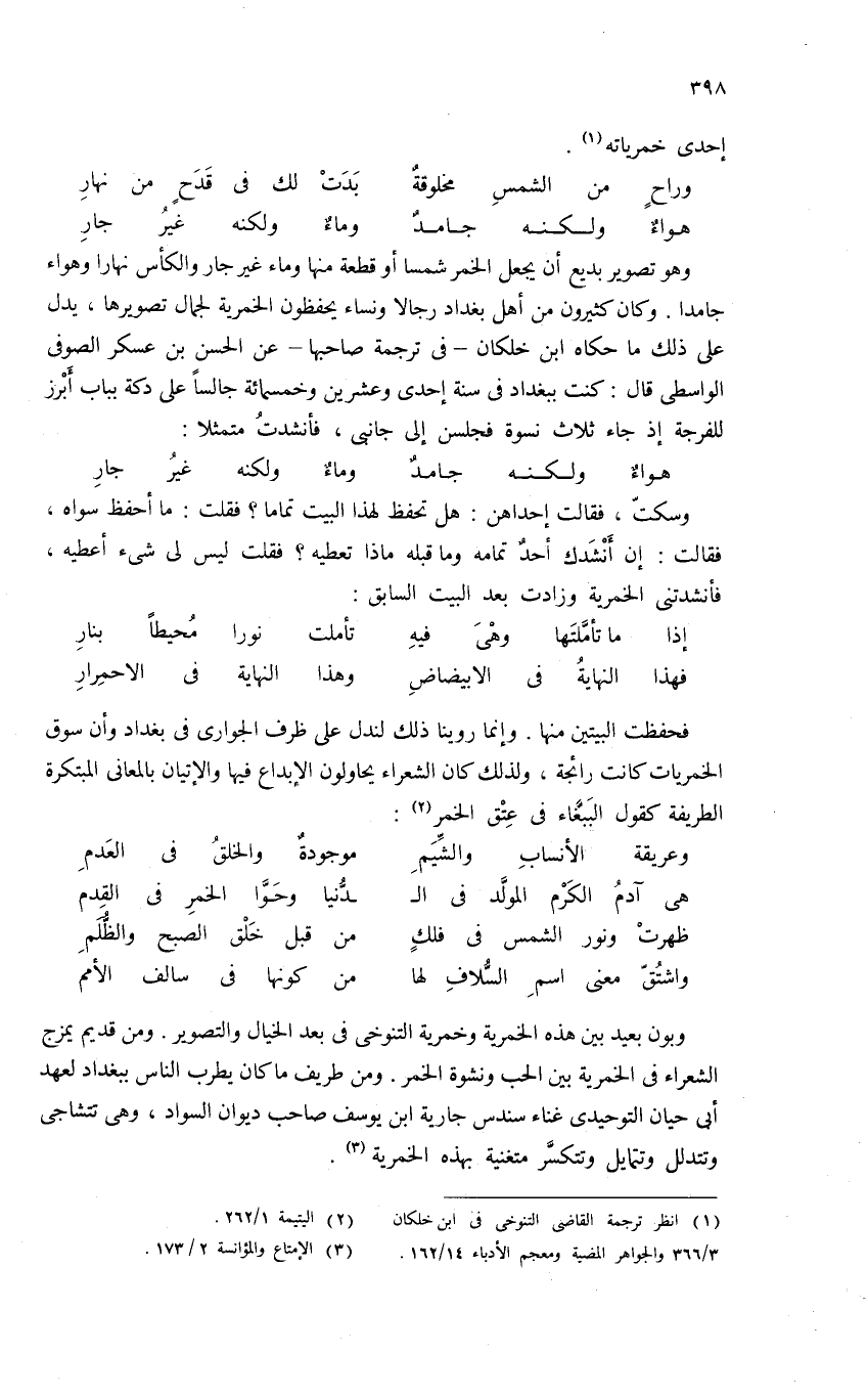 وبون بعيد بين هذه الخمرية وخمرية التنوخى فى بعد الخيال والتصوير. ومن قديم يمزج الشعراء فى الخمرية بين الحب ونشوة الخمر. ومن طريف ما كان يطرب الناس ببغداد لعهد أبى حيان التوحيدى غناء سندس جارية ابن يوسف صاحب ديوان السواد، وهى تتشاجى وتتدلل وتتمايل وتتكسّر متغنية بهذه الخمرية (¬3).