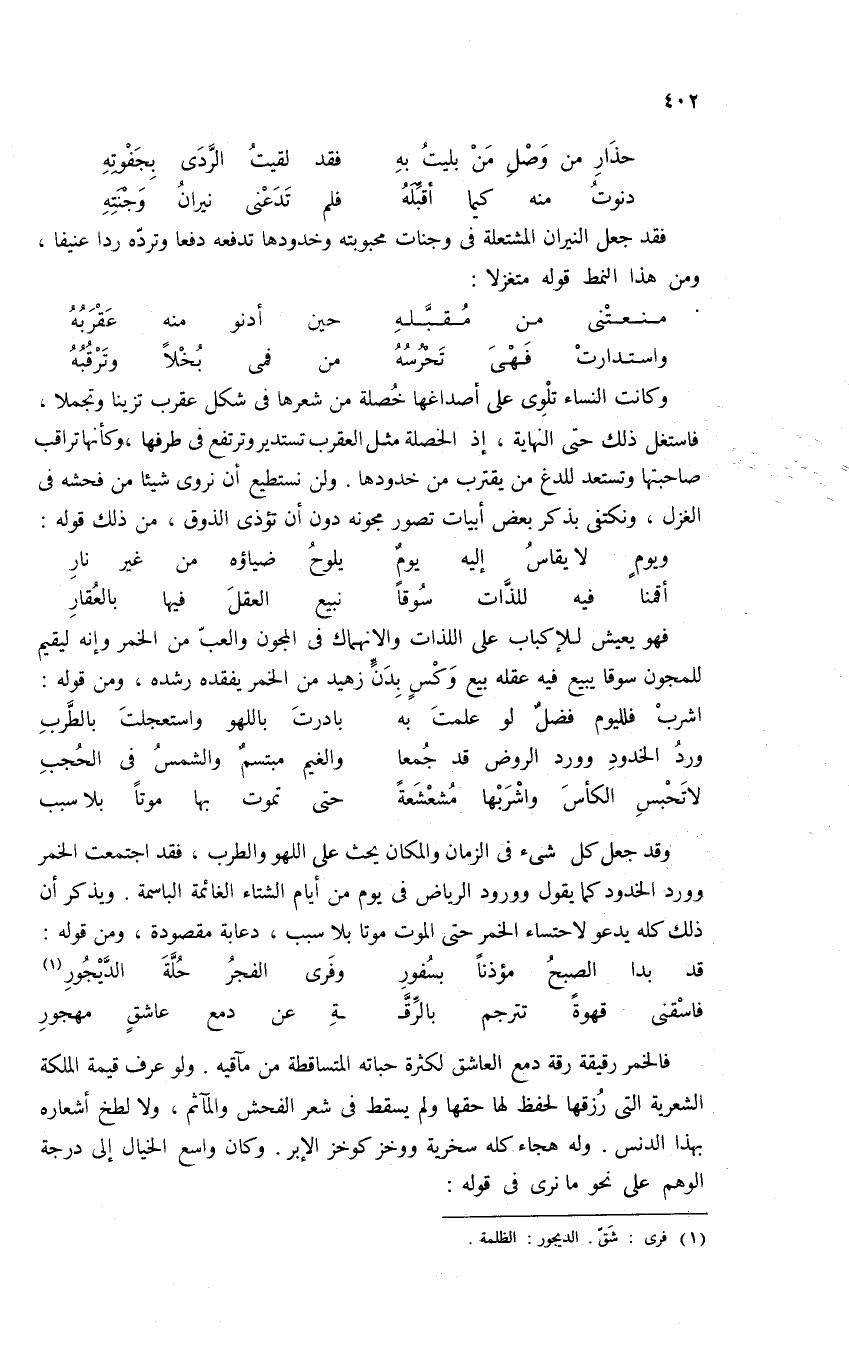 فالخمر رقيقة رقة دمع العاشق لكثرة حباته المتساقطة من مآقيه. ولو عرف قيمة الملكة الشعرية التى رزقها لحفظ لها حقها ولم يسقط فى شعر الفحش والمآثم، ولا لطخ أشعاره بهذا الدنس. وله هجاء كله سخرية ووخز كوخز الإبر. وكان واسع الخيال إلى درجة الوهم على نحو ما نرى فى قوله: