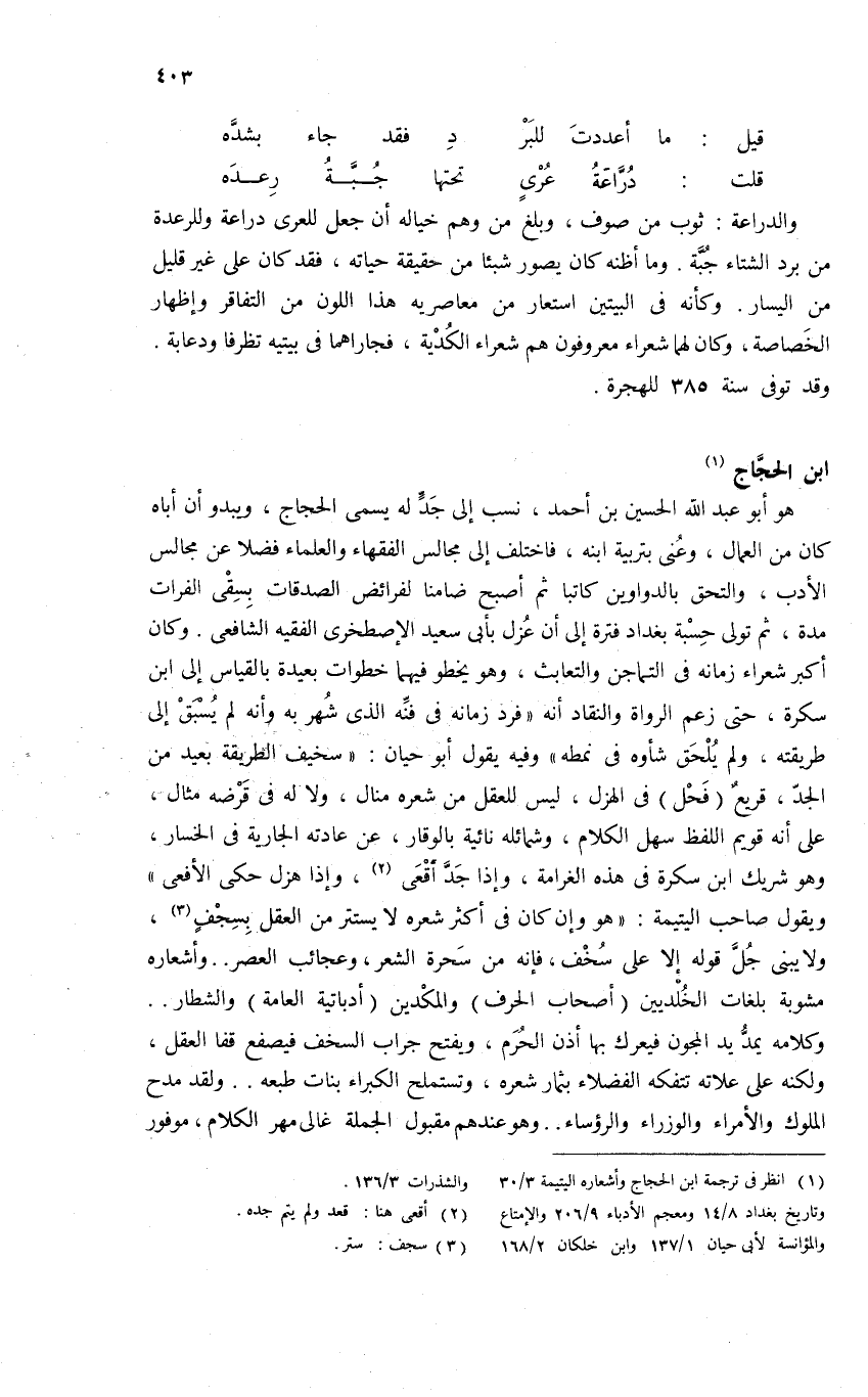 (¬1) انظر فى ترجمة ابن الحجاج وأشعاره اليتيمة 3/ 30 وتاريخ بغداد 8/ 14 ومعجم الأدباء 9/ 206 والإمتاع والمؤانسة لأبى حيان 1/ 137 وابن خلكان 2/ 168 والشذرات 3/ 136.