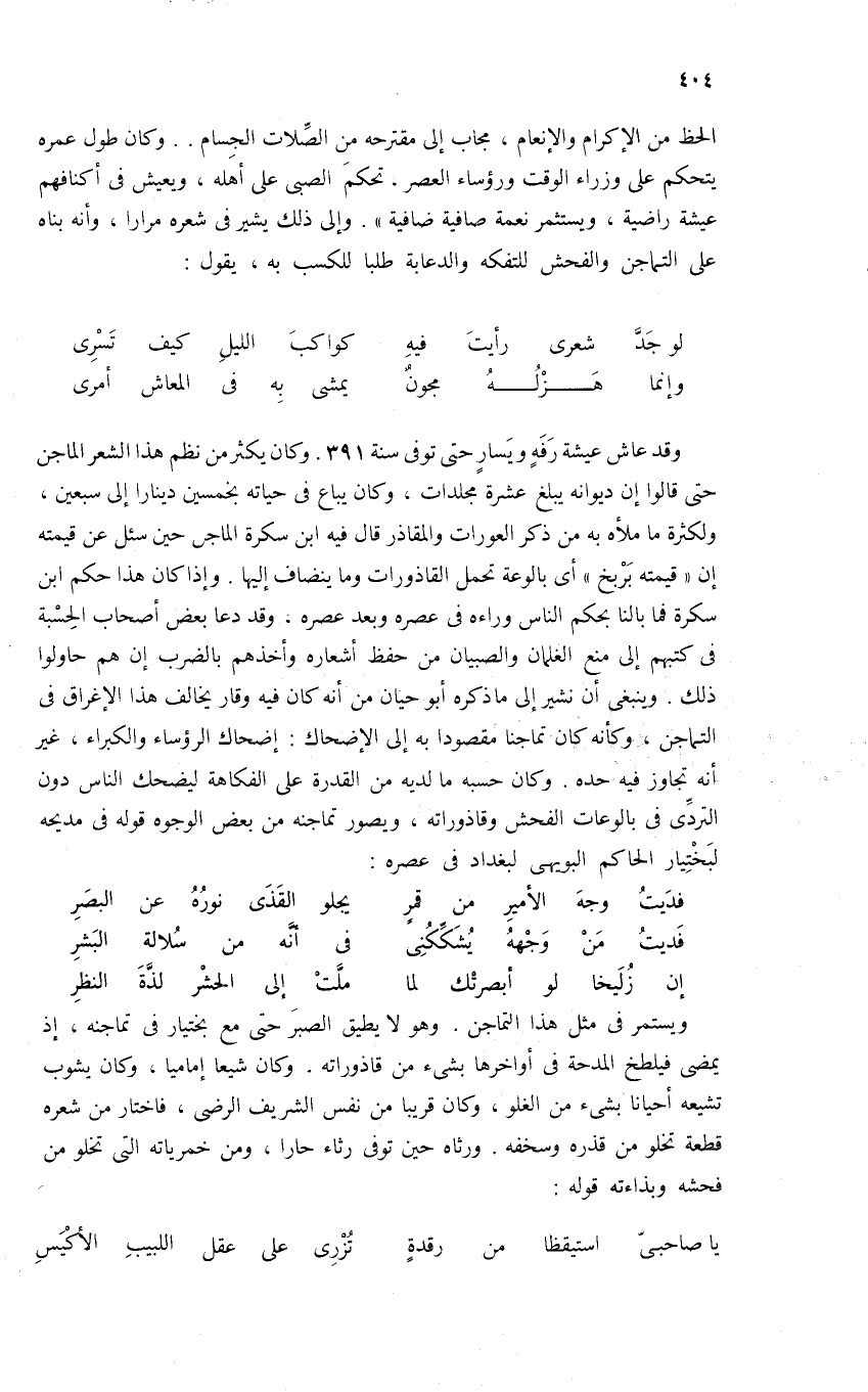 وقد عاش عيشة رفه ويسار حتى توفى سنة 391. وكان يكثر من نظم هذا الشعر الماجن حتى قالوا إن ديوانه يبلغ عشرة مجلدات، وكان يباع فى حياته بخمسين دينارا إلى سبعين، ولكثرة ما ملأه به من ذكر العورات والمقاذر قال فيه ابن سكرة الماجن حين سئل عن قيمته إن «قيمته بربخ» أى بالوعة تحمل القاذورات وما ينضاف إليها. وإذا كان هذا حكم ابن سكرة فما بالنا بحكم الناس وراءه فى عصره وبعد عصره، وقد دعا بعض أصحاب الحسبة فى كتبهم إلى منع الغلمان والصبيان من حفظ أشعاره وأخذهم بالضرب إن هم حاولوا ذلك. وينبغى أن نشير إلى ما ذكره أبو حيان من أنه كان فيه وقار يخالف هذا الإغراق فى التماجن، وكأنه كان تماجنا مقصودا به إلى الإضحاك: إضحاك الرؤساء والكبراء، غير أنه تجاوز فيه حده. وكان حسبه ما لديه من القدرة على الفكاهة ليضحك الناس دون التردّى فى بالوعات الفحش وقاذوراته، ويصور تماجنه من بعض الوجوه قوله فى مديحه لبختيار الحاكم البويهى لبغداد فى عصره: