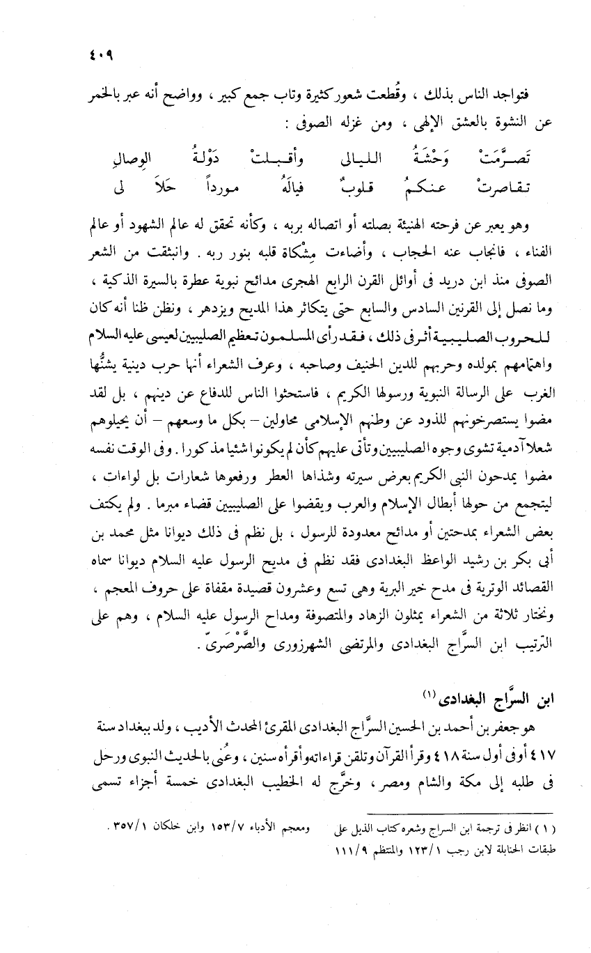 (¬1) انظر فى ترجمة ابن السراج وشعره كتاب الذيل على طبقات الحنابلة لابن رجب 1/ 123 والمنتظم 9/ 111 ومعجم الأدباء 7/ 153 وابن خلكان 1/ 357.
