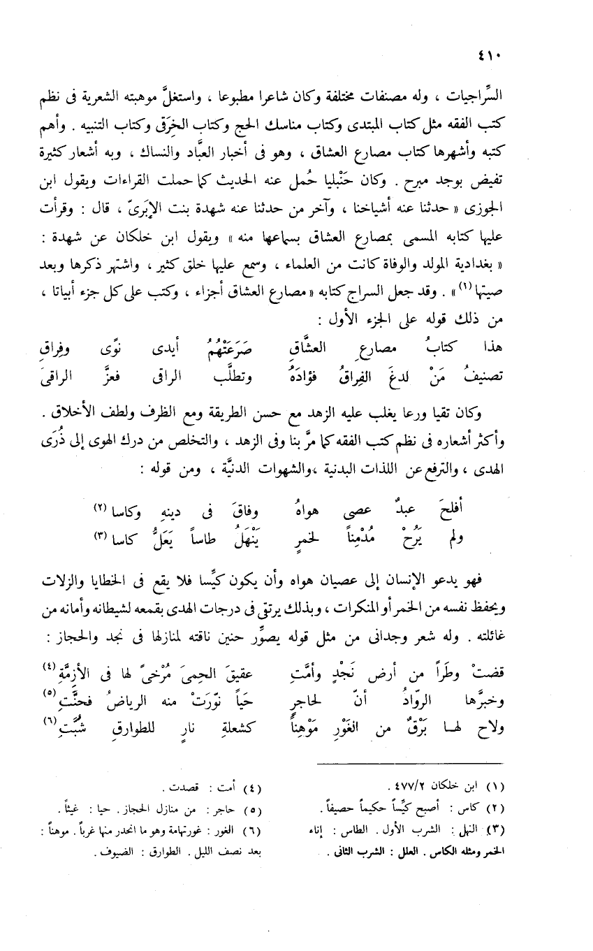 «بغدادية المولد والوفاة كانت من العلماء، وسمع عليها خلق كثير، واشتهر ذكرها وبعد صيتها (¬1)». وقد جعل السراج كتابه «مصارع العشاق أجزاء، وكتب على كل جزء أبياتا، من ذلك قوله على الجزء الأول:
