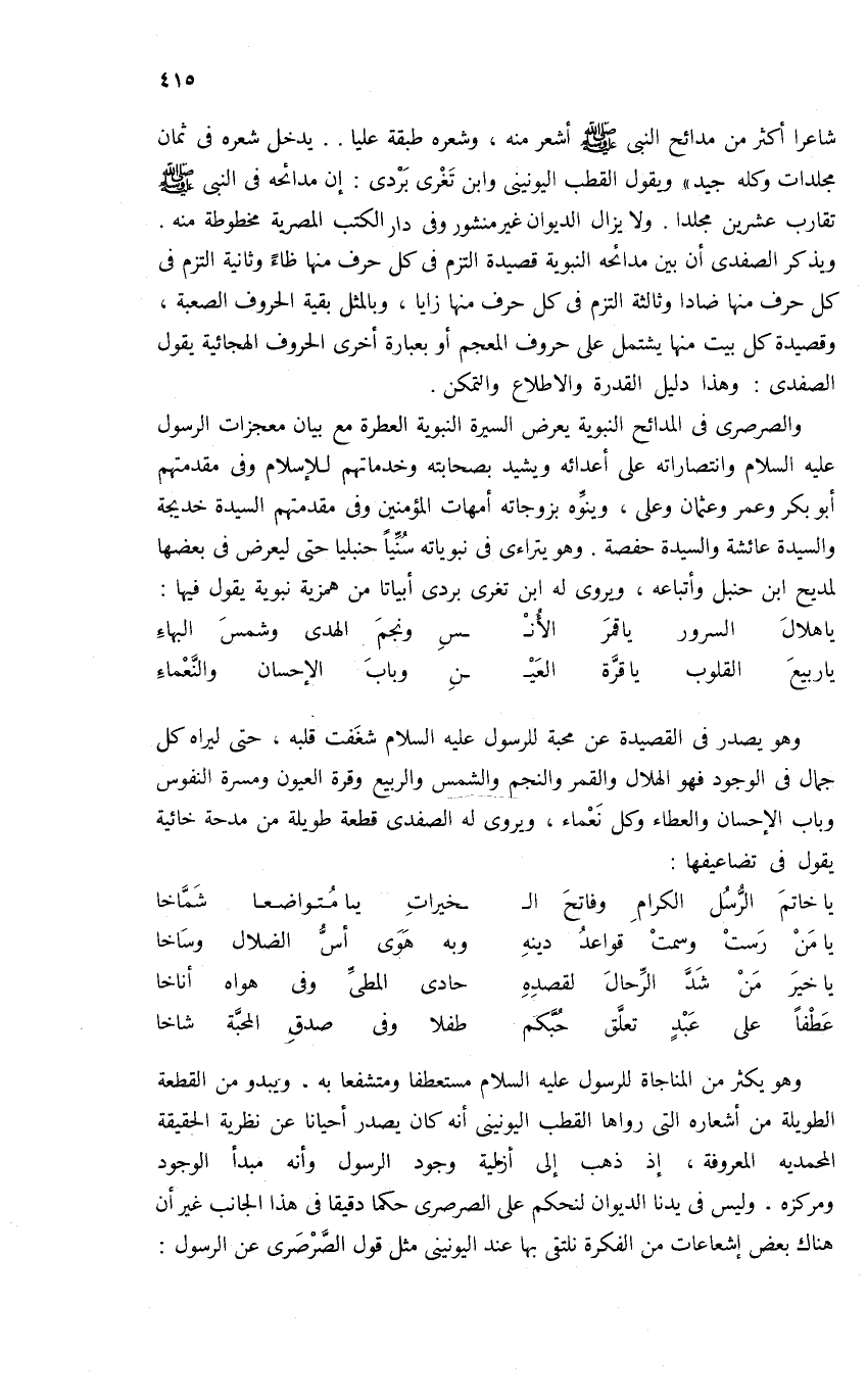 وهو يصدر فى القصيدة عن محبة للرسول عليه السلام شغفت قلبه، حتى ليراه كل جمال فى الوجود فهو الهلال والقمر والنجم والشمس والربيع وقرة العيون ومسرة النفوس وباب الإحسان والعطاء وكل نعماء، ويروى له الصفدى قطعة طويلة من مدحة خائية يقول فى تضاعيفها: