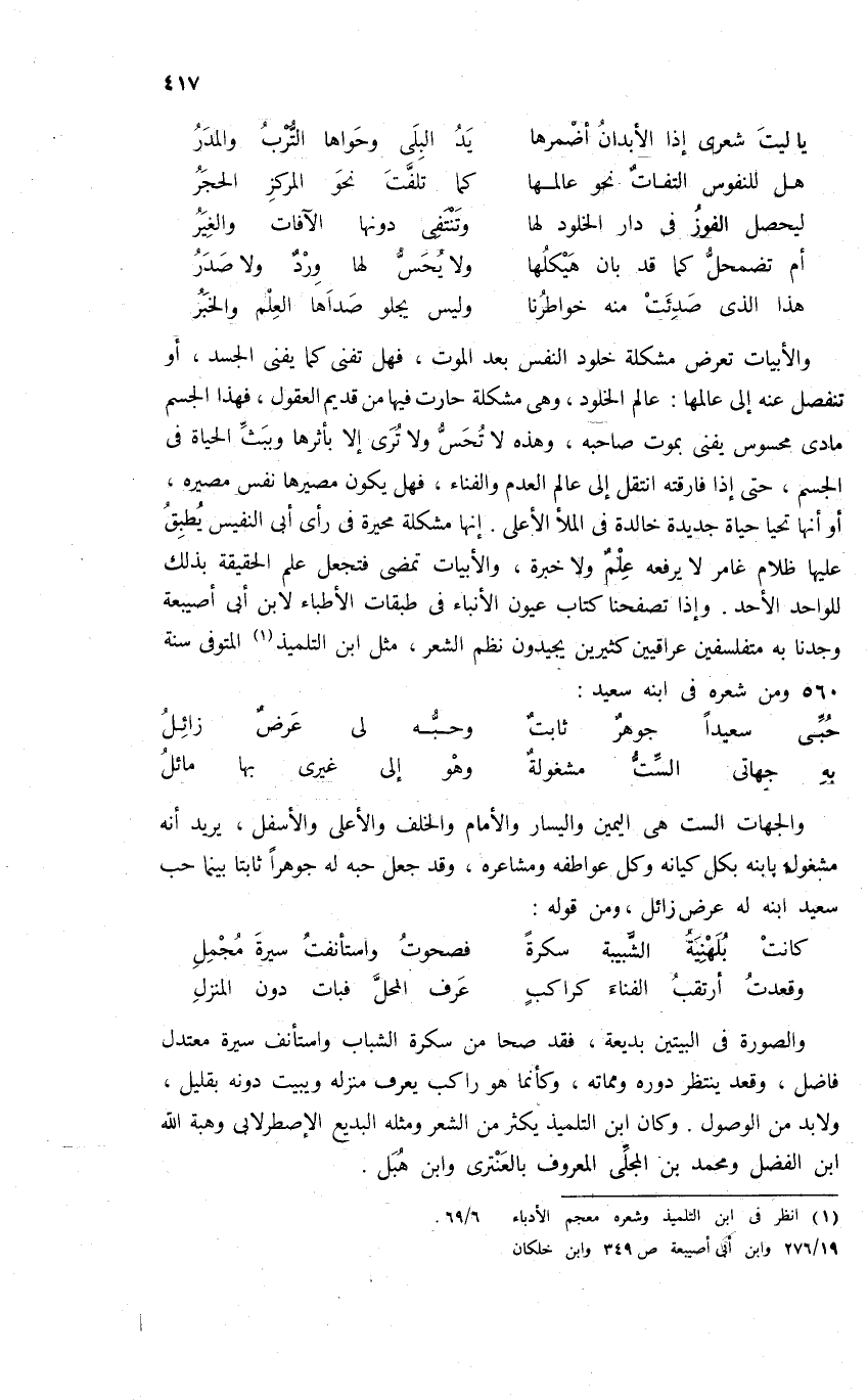 والأبيات تعرض مشكلة خلود النفس بعد الموت، فهل تفنى كما يفنى الجسد، أو تنفصل عنه إلى عالمها: عالم الخلود، وهى مشكلة حارت فيها من قديم العقول، فهذا الجسم مادى محسوس يفنى بموت صاحبه، وهذه لا تحسّ ولا ترى إلا بأثرها وببثّ الحياة فى الجسم، حتى إذا فارقته انتقل إلى عالم العدم والفناء، فهل يكون مصيرها نفس مصيره، أو أنها تحيا حياة جديدة خالدة فى الملأ الأعلى. إنها مشكلة محيرة فى رأى أبى النفيس يطبق عليها ظلام غامر لا يرفعه علم ولا خبرة، والأبيات تمضى فتجعل علم الحقيقة بذلك للواحد الأحد. وإذا تصفحنا كتاب عيون الأنباء فى طبقات الأطباء لابن أبى أصيبعة وجدنا به متفلسفين عراقيين كثيرين يجيدون نظم الشعر، مثل ابن التلميذ (¬1) المتوفى سنة 560 ومن شعره فى ابنه سعيد: