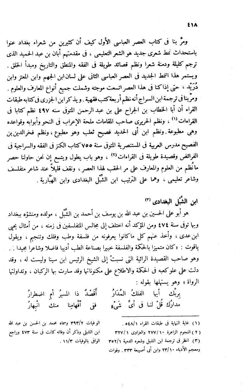 (¬3) انظر فى ترجمة ابن الشبل وشعره الدمية 1/ 352 ومعجم الأدباء 10/ 23 وابن أبى أصيبعة 333. وفوات الوفيات 2/ 393 وسماه محمد بن الحسن بن عبد الله ابن الشبلى وذكر أن وفاته كانت فى سنة 473 وراجع الوافى بالوفيات 3/ 11.