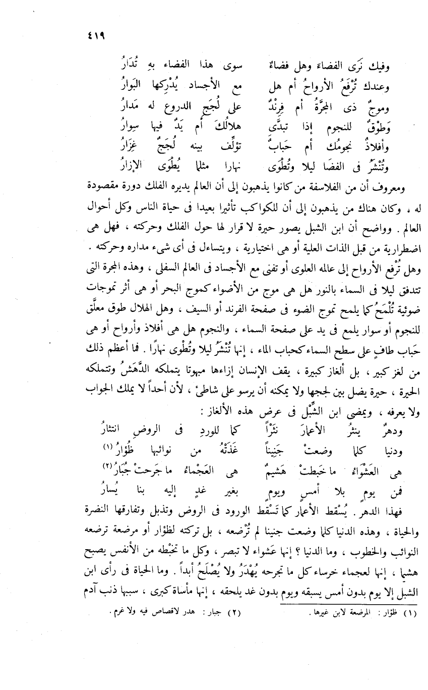 وهل ترفع الأرواح إلى عالمه العلوى أو تفنى مع الأجساد فى العالم السفلى، وهذه المجرة التى تتدفق ليلا فى السماء بالنور هل هى موج من الأضواء كموج البحر أو هى أثر تموجات ضوئية تلمح كما يلمح تموج الضوء فى صفحة الفرند أو السيف، وهل الهلال طوق معلّق للنجوم أو سوار يلمع فى يد على صفحة السماء، والنجوم هل هى أفلاذ وأرواح أو هى حباب طاف على سطح السماء كحباب الماء، إنها تنشر ليلا وتطوى نهارا. فما أعظم ذلك من لغز كبير، بل ألغاز كبيرة، يقف الإنسان إزاءها مبهوتا يتملكه الدّهش وتتملكه الحيرة، حيرة يضل بين لججها ولا يمكنه أن يرسو على شاطئ، لأن أحدا لا يملك الجواب ولا يعرفه، ويمضى ابن الشّبل فى عرض هذه الألغاز: