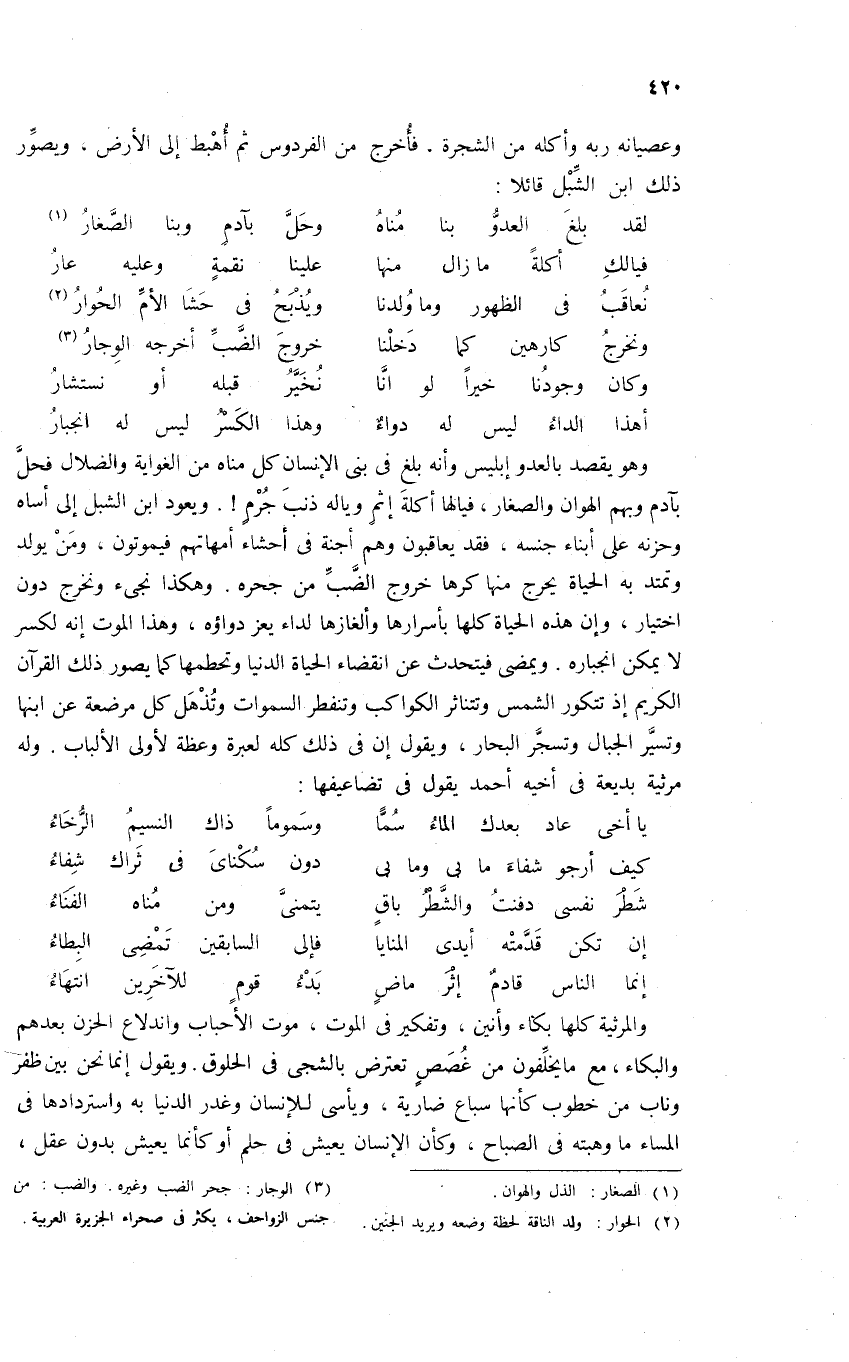 وهو يقصد بالعدو إبليس وأنه بلغ فى بنى الإنسان كل مناه من الغواية والضلال فحلّ بآدم وبهم الهوان والصغار، فيالها أكلة إثم ويا له ذنب جرم! . ويعود ابن الشبل إلى أساه وحزنه على أبناء جنسه، فقد يعاقبون وهم أجنة فى أحشاء أمهاتهم فيموتون، ومن يولد وتمتد به الحياة يحرج منها كرها خروج الضّبّ من جحره. وهكذا نجئ ونخرج دون اختيار، وإن هذه الحياة كلها بأسرارها وألغازها لداء يعز دواؤه، وهذا الموت إنه لكسر لا يمكن انجباره. ويمضى فيتحدث عن انقضاء الحياة الدنيا وتحطمها كما يصور ذلك القرآن الكريم إذ تتكور الشمس وتتناثر الكواكب وتنفطر السموات وتذهل كل مرضعة عن ابنها وتسيّر الجبال وتسجّر البحار، ويقول إن فى ذلك كله لعبرة وعظة لأولى الألباب. وله مرثية بديعة فى أخيه أحمد يقول فى تضاعيفها: