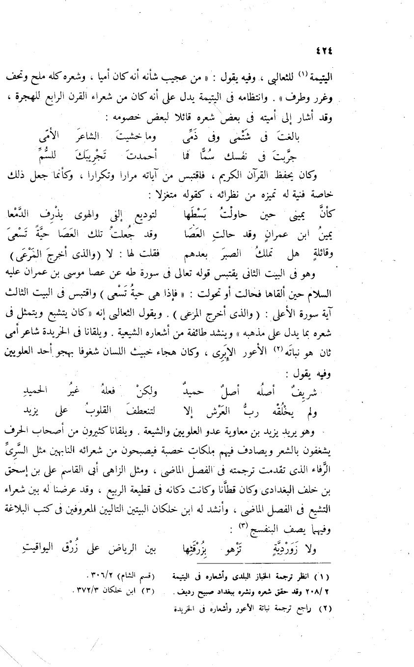 وهو فى البيت الثانى يقتبس قوله تعالى فى سورة طه عن عصا موسى بن عمران عليه السلام حين ألقاها فحالت أو تحولت: «فإذا هى حية تسعى) واقتبس فى البيت الثالث آية سورة الأعلى: (والذى أخرج المرعى). ويقول الثعالبى إنه «كان يتشيع ويتمثل فى شعره بما يدل على مذهبه» وينشد طائفة من أشعاره الشيعية. ويلقانا فى الخريدة شاعر أمى ثان هو نباته (¬2) الأعور الإبرى، وكان هجاء خبيث اللسان شغوفا بهجو أحد العلويين وفيه يقول: