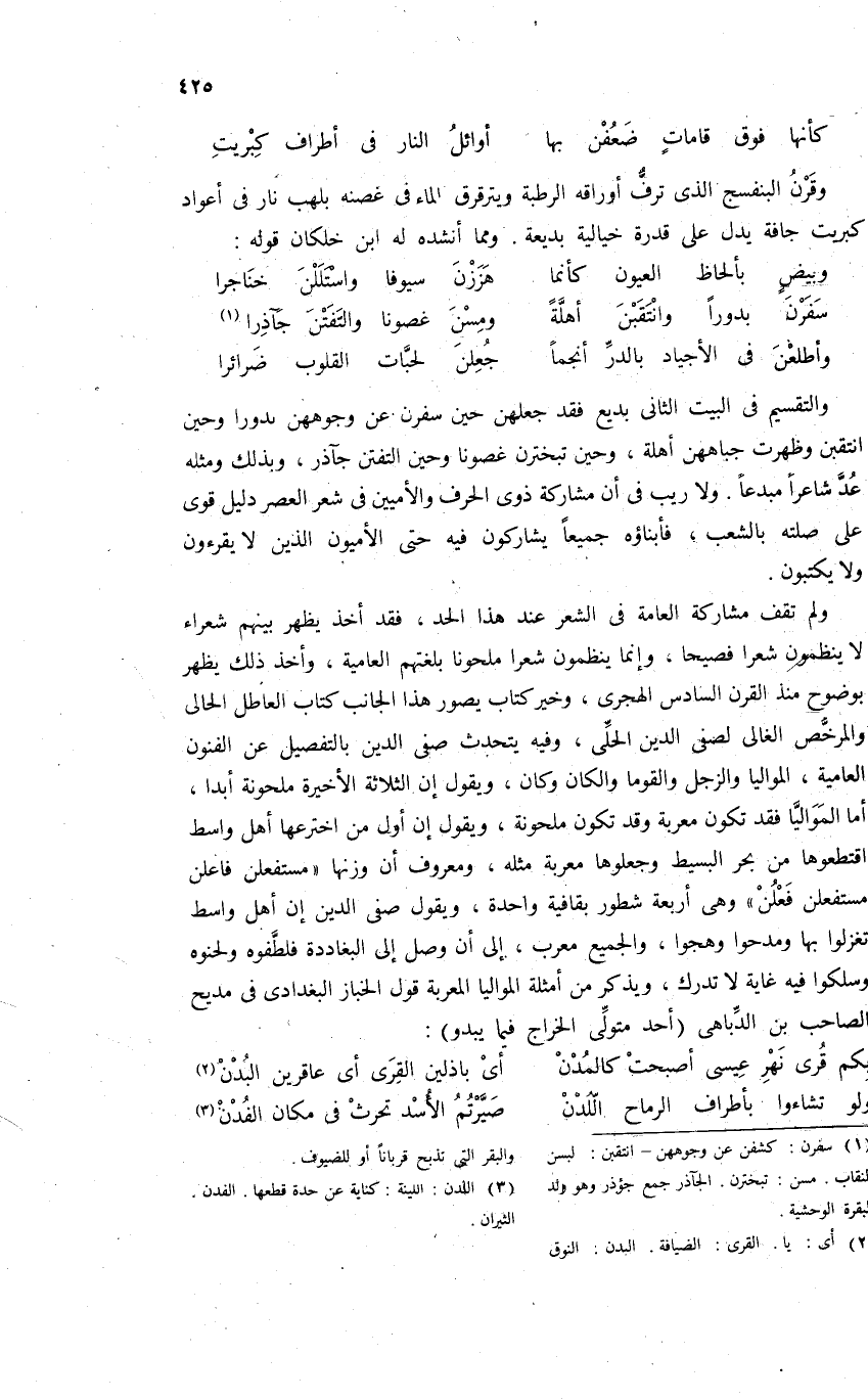 ولم تقف مشاركة العامة فى الشعر عند هذا الحد، فقد أخذ يظهر بينهم شعراء لا ينظمون شعرا فصيحا، وإنما ينظمون شعرا ملحونا بلغتهم العامية، وأخذ ذلك يظهر بوضوح منذ القرن السادس الهجرى، وخير كتاب يصور هذا الجانب كتاب العاطل الحالى والمرخّص الغالى لصفى الدين الحلّى، وفيه يتحدث صفى الدين بالتفصيل عن الفنون العامية، المواليا والزجل والقوما والكان وكان، ويقول إن الثلاثة الأخيرة ملحونة أبدا، أما المواليّا فقد تكون معربة وقد تكون ملحونة، ويقول إن أول من اخترعها أهل واسط اقتطعوها من بحر البسيط وجعلوها معربة مثله، ومعروف أن وزنها «مستفعلن فاعلن مستفعلن فعلن» وهى أربعة شطور بقافية واحدة، ويقول صفى الدين إن أهل واسط تغزلوا بها ومدحوا وهجوا، والجميع معرب، إلى أن وصل إلى البغاددة فلطّفوه ولحنوه وسلكوا فيه غاية لا تدرك، ويذكر من أمثلة المواليا المعربة قول الخباز البغدادى فى مديح الصاحب بن الدّباهى (أحد متولّى الخراج فيما يبدو):