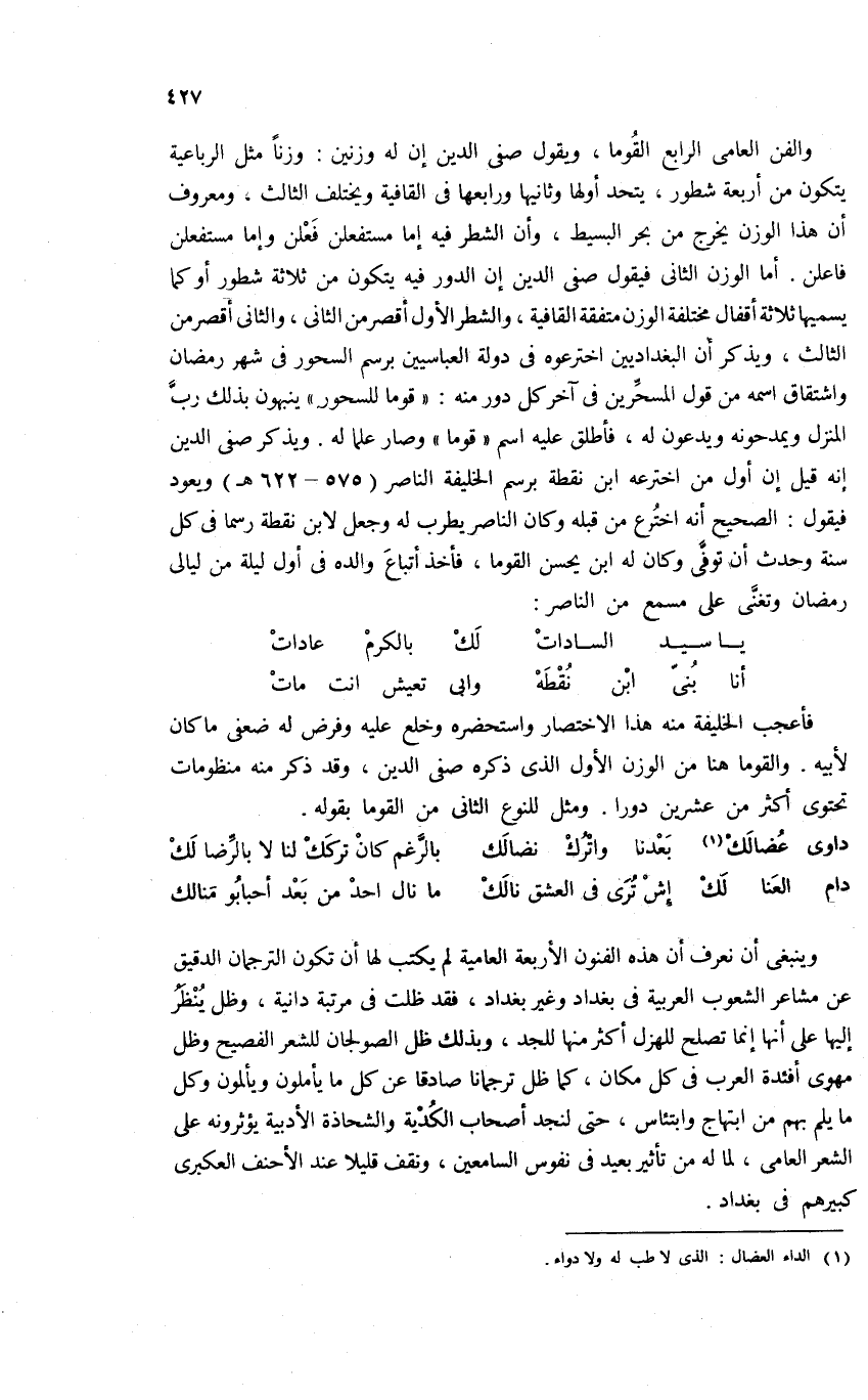 فأعجب الخليفة منه هذا الاختصار واستحضره وخلع عليه وفرض له ضعفى ما كان لأبيه. والقوما هنا من الوزن الأول الذى ذكره صفى الدين، وقد ذكر منه منظومات تحتوى أكثر من عشرين دورا. ومثل للنوع الثانى من القوما بقوله.