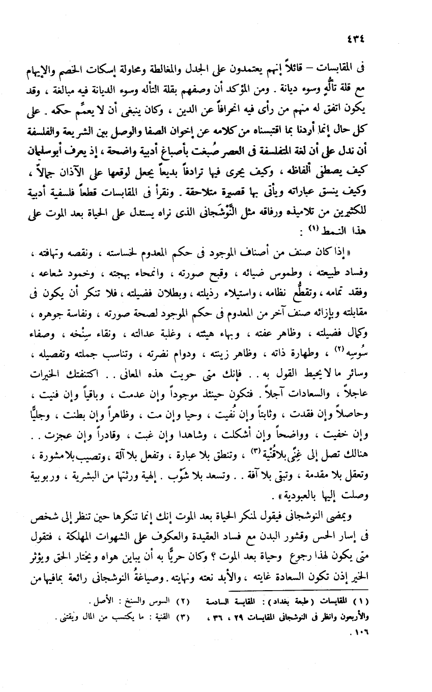 (¬1) المقايسات (طبعة بغداد): المقايسة السادسة والأربعون وانظر فى النوشجانى المقايسات 29، 36، 106.