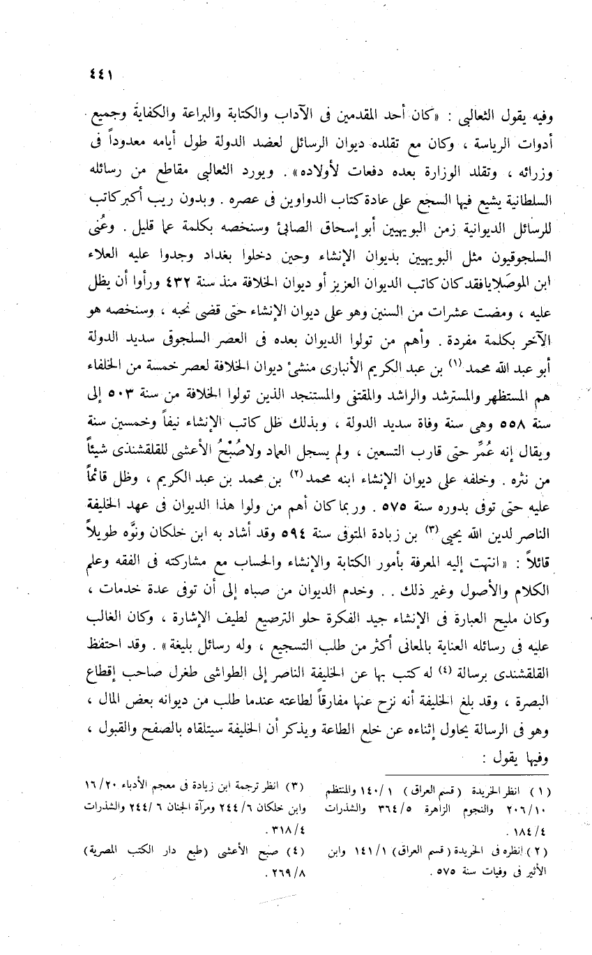 وفيه يقول الثعالبى: «كان أحد المقدمين فى الآداب والكتابة والبراعة، والكفاية وجميع أدوات الرياسة، وكان مع تقلده ديوان الرسائل لعضد الدولة طول أيامه معدودا فى وزرائه، وتقلد الوزارة بعده دفعات لأولاده». ويورد الثعالبى مقاطع من رسائله السلطانية يشيع فيها السجع على عادة كتاب الدواوين فى عصره. وبدون ريب أكبر كاتب للرسائل الديوانية زمن البويهيين أبو إسحاق الصابئ وسنخصه بكلمة عما قليل. وعنى السلجوقيون مثل البويهيين بديوان الإنشاء وحين دخلوا بغداد وجدوا عليه العلاء ابن الموصلا يا فقد كان كاتب الديوان العزيز أو ديوان الخلافة منذ سنة 432 ورأوا أن يظل عليه، ومضت عشرات من السنين وهو على ديوان الإنشاء حتى قضى نحبه، وسنخصه هو الآخر بكلمة مفردة. وأهم من تولوا الديوان بعده فى العصر السلجوقى سديد الدولة أبو عبد الله محمد (¬1) بن عبد الكريم الأنبارى منشئ ديوان الخلافة لعصر خمسة من الخلفاء هم المستظهر والمسترشد والراشد والمقتفى والمستنجد الذين تولوا الخلافة من سنة 503 إلى سنة 558 وهى سنة وفاة سديد الدولة، وبذلك ظل كاتب الإنشاء نيفا وخمسين سنة ويقال إنه عمّر حتى قارب التسعين، ولم يسجل العماد ولا صبح الأعشى للقلقشندى شيئا من نثره. وخلفه على ديوان الإنشاء ابنه محمد (¬2) بن محمد بن عبد الكريم، وظل قائما عليه حتى توفى بدوره سنة 575. وربما كان أهم من ولوا هذا الديوان فى عهد الخليفة الناصر لدين الله يحيى (¬3) بن زبادة المتوفى سنة 594 وقد أشاد به ابن خلكان ونوّه طويلا قائلا: «انتهت إليه المعرفة بأمور الكتابة والإنشاء والحساب مع مشاركته فى الفقه وعلم الكلام والأصول وغير ذلك. . وخدم الديوان من صباه إلى أن توفى عدة خدمات، وكان مليح العبارة فى الإنشاء جيد الفكرة حلو الترصيع لطيف الإشارة، وكان الغالب عليه فى رسائله العناية بالمعانى أكثر من طلب التسجيع، وله رسائل بليغة». وقد احتفظ القلقشندى برسالة (¬4) له كتب بها عن الخليفة الناصر إلى الطواشى طغرل صاحب إقطاع البصرة، وقد بلغ الخليفة أنه نزح عنها مفارقا لطاعته عند ما طلب من ديوانه بعض المال، وهو فى الرسالة يحاول إثناءه عن خلع الطاعة ويذكر أن الخليفة سيتلقاه بالصفح والقبول، وفيها يقول: