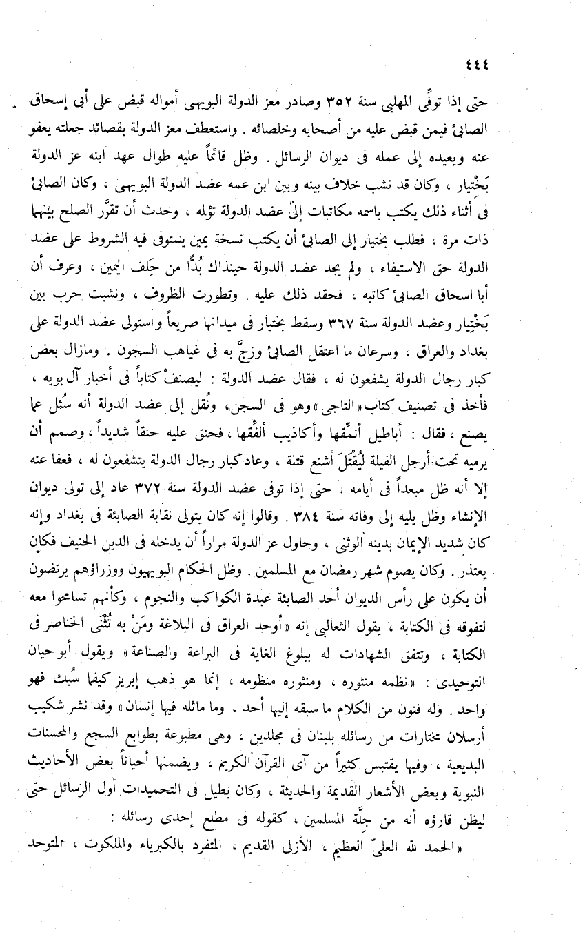 حتى إذا توفّى المهلبى سنة 352 وصادر معز الدولة البويهى أمواله قبض على أبى إسحاق الصابئ فيمن قبض عليه من أصحابه وخلصائه. واستعطف معز الدولة بقصائد جعلته يعفو عنه ويعيده إلى عمله فى ديوان الرسائل. وظل قائما عليه طوال عهد ابنه عز الدولة بختيار، وكان قد نشب خلاف بينه وبين ابن عمه عضد الدولة البويهى، وكان الصابئ فى أثناء ذلك يكتب باسمه مكاتبات إلى عضد الدولة تؤلمه، وحدث أن تقرّر الصلح بينهما ذات مرة، فطلب بختيار إلى الصابئ أن يكتب نسخة يمين يستوفى فيه الشروط على عضد الدولة حق الاستيفاء، ولم يجد عضد الدولة حينذاك بدّا من حلف اليمين، وعرف أن أبا اسحاق الصابئ كاتبه، فحقد ذلك عليه. وتطورت الظروف، ونشبت حرب بين بختيار وعضد الدولة سنة 367 وسقط بختيار فى ميدانها صريعا واستولى عضد الدولة على بغداد والعراق، وسرعان ما اعتقل الصابئ وزجّ به فى غياهب السجون. وما زال بعض كبار رجال الدولة يشفعون له، فقال عضد الدولة: ليصنف كتابا فى أخبار آل بويه، فأخذ فى تصنيف كتاب «التاجى» وهو فى السجن، ونقل إلى عضد الدولة أنه سئل عما يصنع، فقال: أباطيل أنمّقها وأكاذيب ألفّقها، فحنق عليه حنقا شديدا، وصمم أن يرميه تحت أرجل الفيلة ليقتل أشنع قتلة، وعاد كبار رجال الدولة يتشفعون له، فعفا عنه إلا أنه ظل مبعدا فى أيامه، حتى إذا توفى عضد الدولة سنة 372 عاد إلى تولى ديوان الإنشاء وظل يليه إلى وفاته سنة 384. وقالوا إنه كان يتولى نقابة الصابئة فى بغداد وإنه كان شديد الإيمان بدينه الوثنى، وحاول عز الدولة مرارا أن يدخله فى الدين الحنيف فكان يعتذر. وكان يصوم شهر رمضان مع المسلمين. وظل الحكام البويهيون ووزراؤهم يرتضون أن يكون على رأس الديوان أحد الصابئة عبدة الكواكب والنجوم، وكأنهم تسامحوا معه لتفوقه فى الكتابة، يقول الثعالبى إنه «أوحد العراق فى البلاغة ومن به تثنى الخناصر فى الكتابة، وتتفق الشهادات له ببلوغ الغاية فى البراعة والصناعة» ويقول أبو حيان التوحيدى: «نظمه منثوره، ومنثوره منظومه، إنما هو ذهب إبريز كيفما سبك فهو واحد. وله فنون من الكلام ما سبقه إليها أحد، وما ماثله فيها إنسان» وقد نشر شكيب أرسلان مختارات من رسائله بلبنان فى مجلدين، وهى مطبوعة بطوابع السجع والمحسنات البديعية، وفيها يقتبس كثيرا من آى القرآن الكريم، ويضمنها أحيانا بعض الأحاديث النبوية وبعض الأشعار القديمة والحديثة، وكان يطيل فى التحميدات أول الرسائل حتى ليظن قارؤه أنه من جلّة المسلمين، كقوله فى مطلع إحدى رسائله: