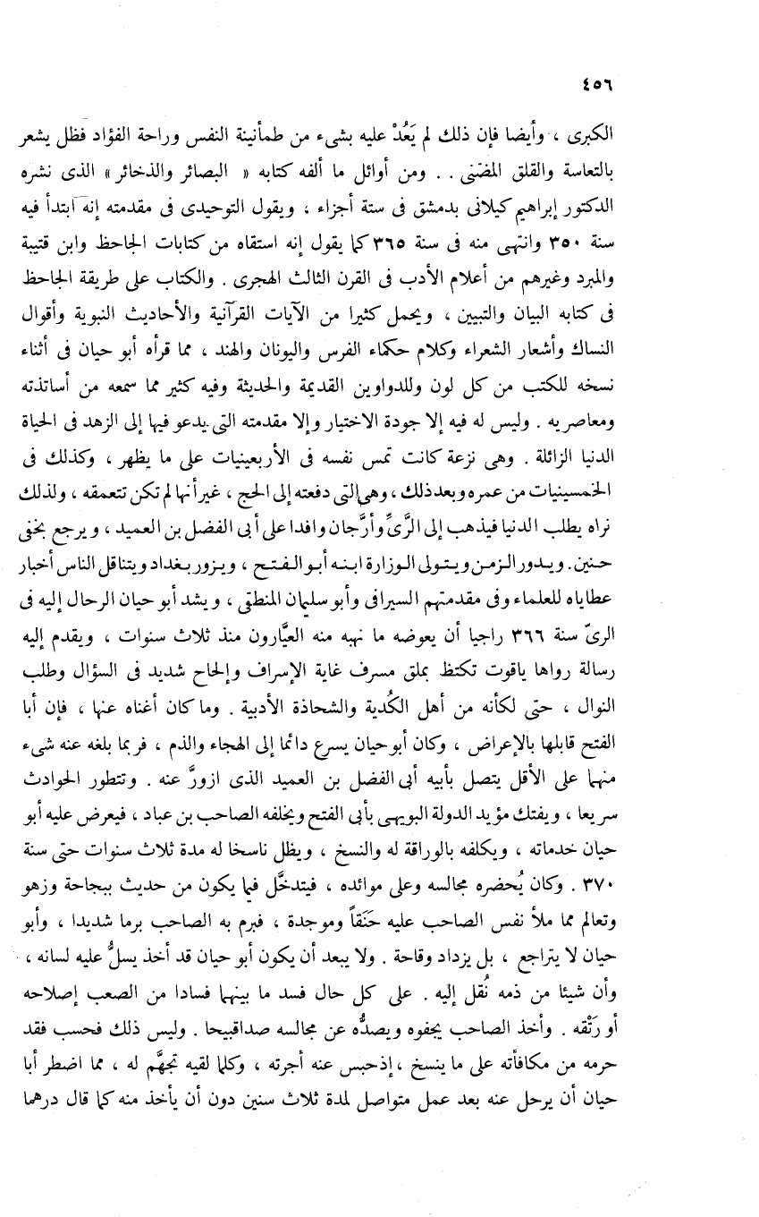 الكبرى، وأيضا فإن ذلك لم يعد عليه بشئ من طمأنينة النفس وراحة الفؤاد فظل يشعر بالتعاسة والقلق المضنى. . ومن أوائل ما ألفه كتابه «البصائر والذخائر» الذى نشره الدكتور إبراهيم كيلانى بدمشق فى ستة أجزاء، ويقول التوحيدى فى مقدمته إنه ابتدأ فيه سنة 350 وانتهى منه فى سنة 365 كما يقول إنه استقاه من كتابات الجاحظ وابن قتيبة والمبرد وغيرهم من أعلام الأدب فى القرن الثالث الهجرى. والكتاب على طريقة الجاحظ فى كتابه البيان والتبيين، ويحمل كثيرا من الآيات القرآنية والأحاديث النبوية وأقوال النساك وأشعار الشعراء وكلام حكماء الفرس واليونان والهند، مما قرأه أبو حيان فى أثناء نسخه للكتب من كل لون وللدواوين القديمة والحديثة وفيه كثير مما سمعه من أساتذته ومعاصريه. وليس له فيه إلا جودة الاختيار وإلا مقدمته التى يدعو فيها إلى الزهد فى الحياة الدنيا الزائلة. وهى نزعة كانت تمس نفسه فى الأربعينيات على ما يظهر، وكذلك فى الخمسينيات من عمره وبعد ذلك، وهى التى دفعته إلى الحج، غير أنها لم تكن تتعمقه، ولذلك نراه يطلب الدنيا فيذهب إلى الرّىّ وأرّجان وافدا على أبى الفضل بن العميد، ويرجع بخفى حنين. ويدور الزمن ويتولى الوزارة ابنه أبو الفتح، ويزور بغداد ويتناقل الناس أخبار عطاياه للعلماء وفى مقدمتهم السيرافى وأبو سليمان المنطقى، ويشد أبو حيان الرحال إليه فى الرىّ سنة 366 راجيا أن يعوضه ما نهبه منه العيّارون منذ ثلاث سنوات، ويقدم إليه رسالة رواها ياقوت تكتظ بملق مسرف غاية الإسراف وإلحاح شديد فى السؤال وطلب النوال، حتى لكأنه من أهل الكدية والشحاذة الأدبية. وما كان أغناه عنها، فإن أبا الفتح قابلها بالإعراض، وكان أبو حيان يسرع دائما إلى الهجاء والذم، فربما بلغه عنه شئ منهما على الأقل يتصل بأبيه أبى الفضل بن العميد الذى ازورّ عنه. وتتطور الحوادث سريعا، ويفتك مؤيد الدولة البويهى بأبى الفتح ويخلفه الصاحب بن عباد، فيعرض عليه أبو حيان خدماته، ويكلفه بالوراقة له والنسخ، ويظل ناسخا له مدة ثلاث سنوات حتى سنة 370. وكان يحضره مجالسه وعلى موائده، فيتدخّل فيما يكون من حديث ببجاحة وزهو وتعالم مما ملأ نفس الصاحب عليه حنقا وموجدة، فبرم به الصاحب برما شديدا، وأبو حيان لا يتراجع، بل يزداد وقاحة. ولا يبعد أن يكون أبو حيان قد أخذ يسلّ عليه لسانه، وأن شيئا من ذمه نقل إليه. على كل حال فسد ما بينهما فسادا من الصعب إصلاحه أو رتقه. وأخذ الصاحب يجفوه ويصدّه عن مجالسه صداقبيحا. وليس ذلك فحسب فقد حرمه من مكافأته على ما ينسخ، إذ حبس عنه أجرته، وكلما لقيه تجهّم له، مما اضطر أبا حيان أن يرحل عنه بعد عمل متواصل لمدة ثلاث سنين دون أن يأخذ منه كما قال درهما