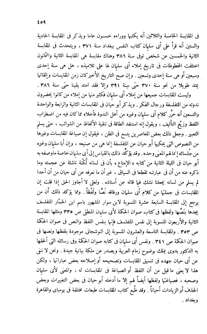 وليست المقابسات جميعها من إملاء أبى سليمان فكثير منها من إملاء من كانوا يحضرون ندوته من المتفلسفة ورجال الفكر. ويذكر أبو حيان فى المقابسات الثانية والرابعة والواحدة والتسعين أنه حرّر كلام أبى سليمان وغيره من أهل الندوة فأخلاه مما كان فيه من اضطراب اللفظ وزيغ التأليف، ويقول إنه استنفد الطاقة فى تنقية الألفاظ من الشوائب، حتى يسلم التعبير. وجعل ذلك بعض المعاصرين يتسع فى الظن، فيقول إن صياغة المقابسات وغيرها من النصوص التى يحكيها أبو حيان عن المتفلسفة إنما هى من صنيعه، وإن أبا سليمان وغيره من جلسائه إنما لهم المعنى وحده. وقد يؤكّد ذلك بالقياس إلى أبى سليمان خاصة ما وصفه به أبو حيان فى الليلة الثانية من كتابه «الإمتاع» بأن فى لسانه لكنة ناشئة عن عجمته وما ذكره عنه من أن فى عبارته تقطعا فى السياق، غير أن ما نعرفه عن أبى حيان من أن أحدا لم يسلم من لسانه يجعلنا نشك فيما قاله عن أستاذه. ولعلى لا أجاوز الحق إذا قلت إن المقابسات فى جملتها من كلام أبى سلمان ورفاقه نصّا ولفظا. ومما يؤكد ذلك أن من يرجع إلى المقابسة السابعة عشرة المنسوبة لابن سوار المشهور باسم ابن الخمّار المتفلسف يجدها بنصّها ولفظها فى كتاب صوان الحكمة لأبى سليمان المنطقى ص 335 ومثلها المقابسة الثانية والأربعون المنسوبة إلى نفس المتفلسف فإنها بنفس اللفظ والنص فى صوان الحكمة ص 353. والمقابسة التاسعة والعشرون المنسوبة إلى النوشجانى موجودة بلفظها ونصها فى صوان الحكمة ص 341. ونفس أبى سليمان فى كتابه صوان الحكمة وفى رسائله التى ألحقها به الدكتور بدوى يملك بوضوح زمام العربية ويصدر عن ملكة بيانية جيدة. ونحن لا ننفى عن أبى حيان جهده فى تنسيق المقابسات وتصحيحه أو إصلاحه بعض عباراتها، ولكن هذا لا يعنى ما قيل من أن اللفظ أو الصياغة فى المقابسات له، والمعنى لأبى سليمان وصحبه، فصياغتها ولفظها أيضا لهم إلا ما أدخله أبو حيان فى بعض التغييرات وبعض الحذف أو الزيادات أحيانا. وقد طبع كتاب المقابسات طبعات مختلفة فى بومباى والقاهرة وبغداد.