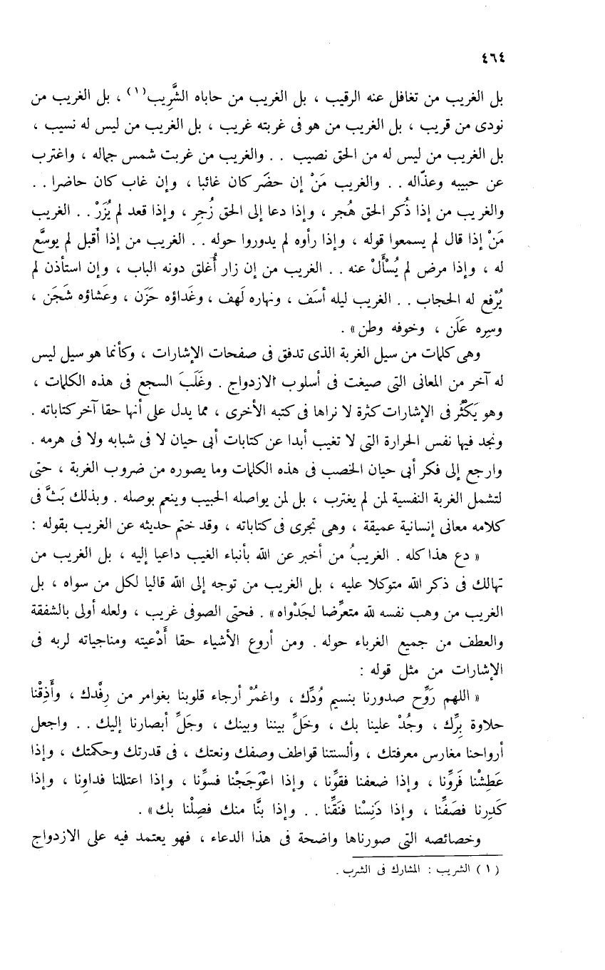 «دع هذا كله. الغريب من أخبر عن الله بأنباء الغيب داعيا إليه، بل الغريب من تهالك فى ذكر الله متوكلا عليه، بل الغريب من توجه إلى الله قاليا لكل من سواه، بل الغريب من وهب نفسه لله متعرّضا لجدواه». فحتى الصوفى غريب، ولعله أولى بالشفقة والعطف من جميع الغرباء حوله. ومن أروع الأشياء حقا أدعيته ومناجياته لربه فى الإشارات من مثل قوله: