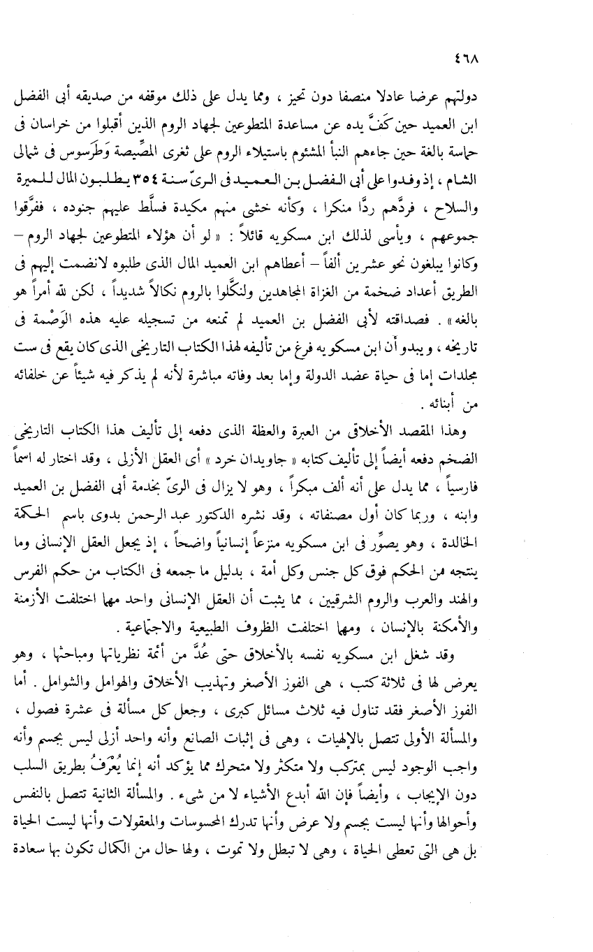 دولتهم عرضا عادلا منصفا دون تحيز، ومما يدل على ذلك موقفه من صديقه أبى الفضل ابن العميد حين كفّ يده عن مساعدة المتطوعين لجهاد الروم الذين أقبلوا من خراسان فى حماسة بالغة حين جاءهم النبأ المشئوم باستيلاء الروم على ثغرى المصّيصة وطرسوس فى شمالى الشام، إذ وفدوا على أبى الفضل بن العميد فى الرىّ سنة 354 يطلبون المال للميرة والسلاح، فردّهم ردّا منكرا، وكأنه خشى منهم مكيدة فسلّط عليهم جنوده، ففرّقوا جموعهم، ويأسى لذلك ابن مسكويه قائلا: «لو أن هؤلاء المتطوعين لجهاد الروم- وكانوا يبلغون نحو عشرين ألفا-أعطاهم ابن العميد المال الذى طلبوه لانضمت إليهم فى الطريق أعداد ضخمة من الغزاة المجاهدين ولنكّلوا بالروم نكالا شديدا، لكن لله أمرا هو بالغه». فصداقته لأبى الفضل بن العميد لم تمنعه من تسجيله عليه هذه الوصمة فى تاريخه، ويبدو أن ابن مسكويه فرغ من تأليفه لهذا الكتاب التاريخى الذى كان يقع فى ست مجلدات إما فى حياة عضد الدولة وإما بعد وفاته مباشرة لأنه لم يذكر فيه شيئا عن خلفائه من أبنائه.