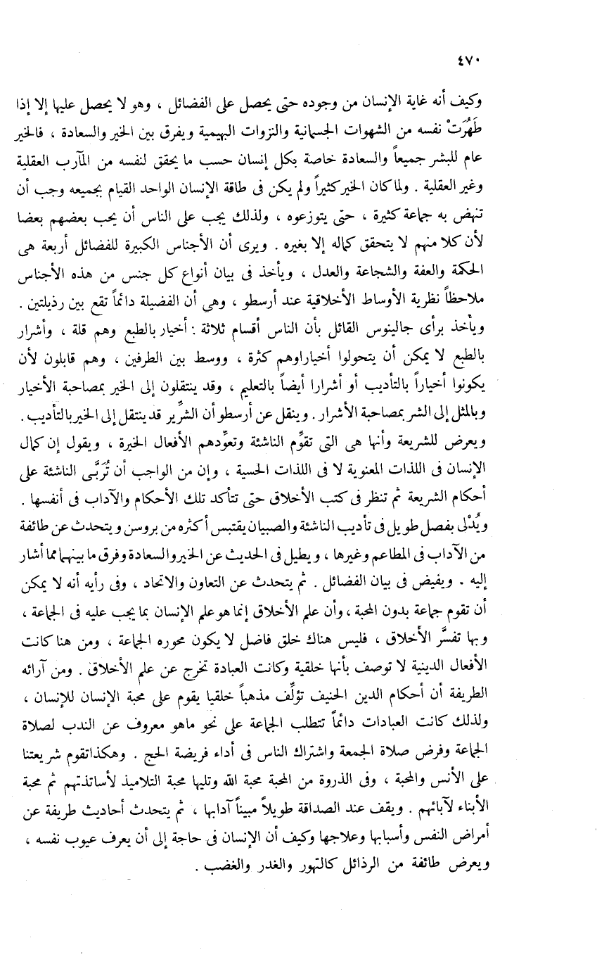 وكيف أنه غاية الإنسان من وجوده حتى يحصل على الفضائل، وهو لا يحصل عليها إلا إذا طهرت نفسه من الشهوات الجسمانية والنزوات البهيمية ويفرق بين الخير والسعادة، فالخير عام للبشر جميعا والسعادة خاصة بكل إنسان حسب ما يحقق لنفسه من المآرب العقلية وغير العقلية. ولما كان الخير كثيرا ولم يكن فى طاقة الإنسان الواحد القيام بجميعه وجب أن تنهض به جماعة كثيرة، حتى يتوزعوه، ولذلك يجب على الناس أن يحب بعضهم بعضا لأن كلا منهم لا يتحقق كماله إلا بغيره. ويرى أن الأجناس الكبيرة للفضائل أربعة هى الحكمة والعفة والشجاعة والعدل، ويأخذ فى بيان أنواع كل جنس من هذه الأجناس ملاحظا نظرية الأوساط الأخلاقية عند أرسطو، وهى أن الفضيلة دائما تقع بين رذيلتين.