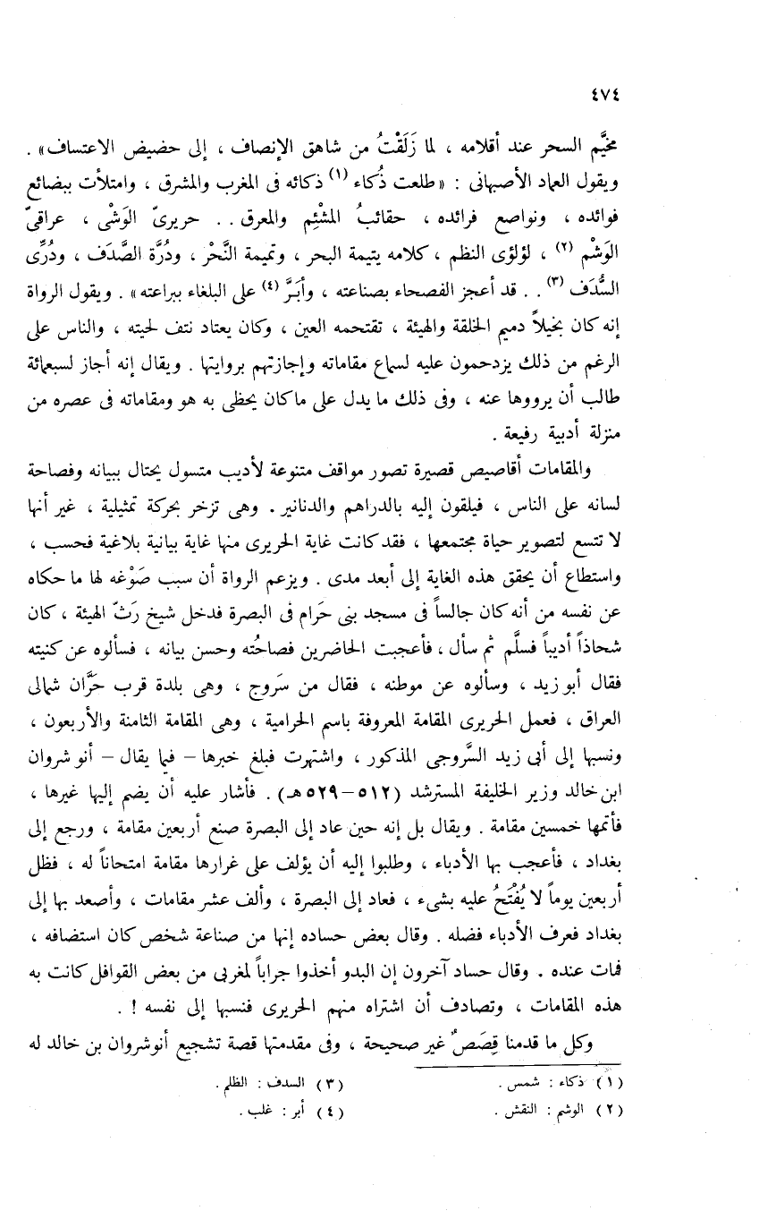 ويقول العماد الأصبهانى: «طلعت ذكاء (¬1) ذكائه فى المغرب والمشرق، وامتلأت ببضائع فوائده، ونواصع فرائده، حقائب المشئم والمعرق. . حريرىّ الوشى، عراقىّ الوشم (¬2)، لؤلؤى النظم، كلامه يتيمة البحر، وتميمة النّحر، ودرّة الصّدف، ودرّى السّدف (¬3). . قد أعجز الفصحاء بصناعته، وأبرّ (¬4) على البلغاء ببراعته». ويقول الرواة إنه كان بخيلا دميم الخلقة والهيئة، تقتحمه العين، وكان يعتاد نتف لحيته، والناس على الرغم من ذلك يزدحمون عليه لسماع مقاماته وإجازتهم بروايتها. ويقال إنه أجاز لسبعمائة طالب أن يرووها عنه، وفى ذلك ما يدل على ما كان يحظى به هو ومقاماته فى عصره من منزلة أدبية رفيعة.