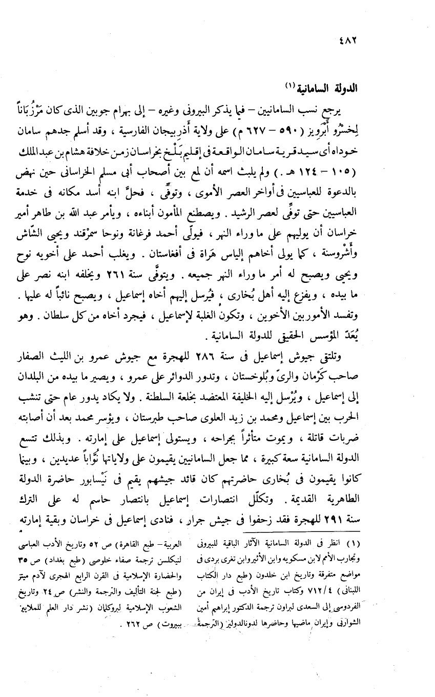 (¬1) انظر فى الدولة السامانية الآثار الباقية للبيرونى وتجارب الأمم لابن مسكويه وابن الأثير وابن تغرى بردى فى مواضع متفرقة وتاريخ ابن خلدون (طبع دار الكتاب اللبنانى) 4/ 712 وكتاب تاريخ الأدب فى إيران من الفردوسى إلى السعدى لبراون ترجمة الدكتور إبراهيم أمين الشواربى وإيران ماضيها وحاضرها لدونالدولير (الترجمة العربية-طبع القاهرة) ص 52 وتاريخ الأدب العباسى لنيكلسن ترجمة صفاء خلوصى (طبع بغداد) ص 35 والحضارة الإسلامية فى القرن الرابع الهجرى لآدم مينز (طبع لجنة التأليف والترجمة والنشر) ص 24 وتاريخ الشعوب الإسلامية لبروكلمان (نشر دار العلم للملايين ببيروت) ص 262.