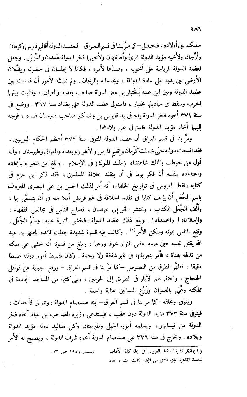 ومرّ بنا فى قسم العراق أن عضد الدولة المتوفى سنة 372 أعظم الحكام البويهيين، فقد اتسعت دولته حتى شملت كرمان وإقليم فارس والأهواز وبغداد والعراق وطبرستان، وأنه أول من خوطب بالملك شاهنشاه (ملك الملوك) فى الإسلام. وبلغ من شعوره بأمجاده واعتداده بنفسه أن فكر يوما فى أن يتقلد خلافة المسلمين، فقد ذكر ابن حزم فى كتابه «نقط العروس فى تواريخ الخلفاء» أنه أمر لذلك الحسن بن على البصرى المعروف باسم الجعل أن يؤلف كتابا فى تقليد الخلافة فى غير قريش أملا منه فى أن يتسمّى بها، وألّف الجعل الكتاب، وانتشر الخبر إلى خراسان، فصاح الناس فى مجالس الفقهاء: