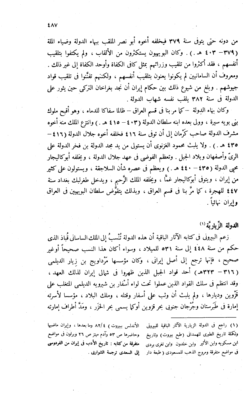 (¬1) راجع فى الدولة الزيارية الآثار الباقية للبيرونى وتكملة تاريخ الطبرى للهمدانى (طبع بيروت) وتاريخ ابن مسكويه وابن الأثير وابن خلدون وابن تغرى بردى فى مواضع متفرقة ومروج الذهب للمسعودى (طبعة دار الأندلس ببيروت) 4/ 82 وما بعدها، وإيران ماضيها وحاضرها ص 53 وآدم مينز ص 26 وبراون فى مواضع متفرقة من كتابه: تاريخ الأدب فى إيران من الفردوسى إلى السعدى ترجمة الشواربى.